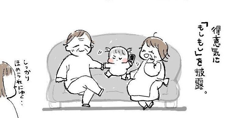 おじいちゃん、おばあちゃんにサンドしてもらいながら披露した「もしもし」は、娘さんにとって少し誇らしいような気分だったことでしょうね。このときの娘さんはどのような様子でしたか。