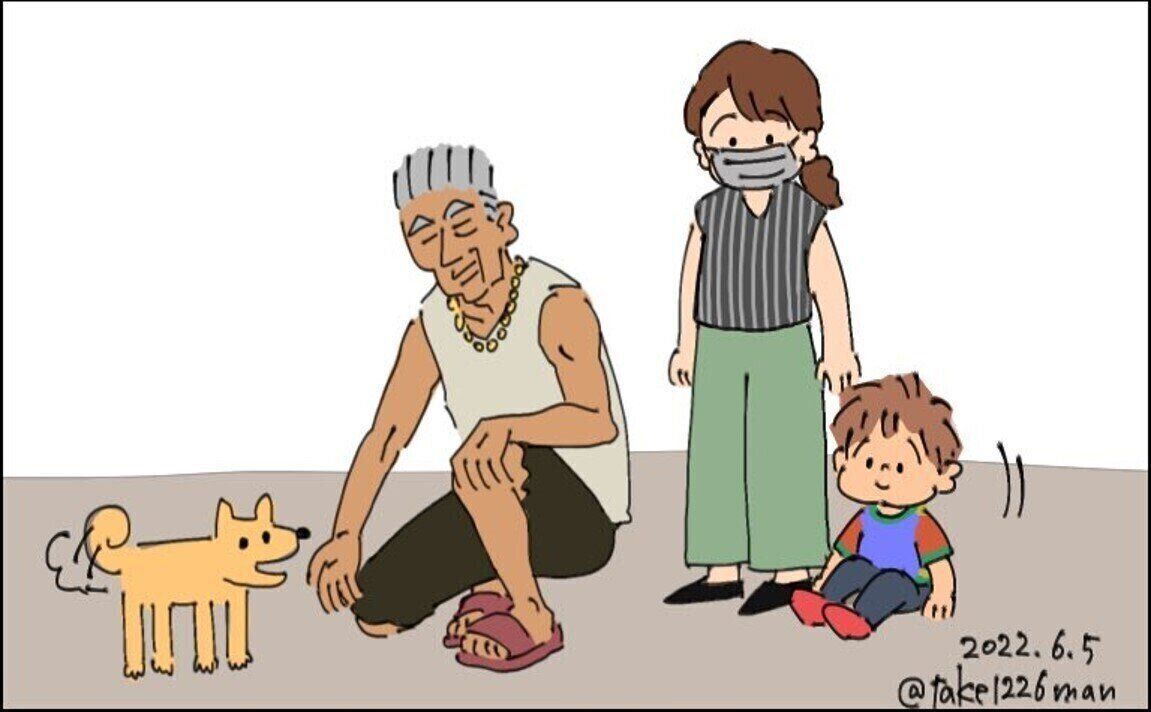 見つめ合う義父とワンコ、そしてお座りする息子くん。思わずクスッと笑ってしまいました。ワンコはこのあと「おすわり」してくれましたか?