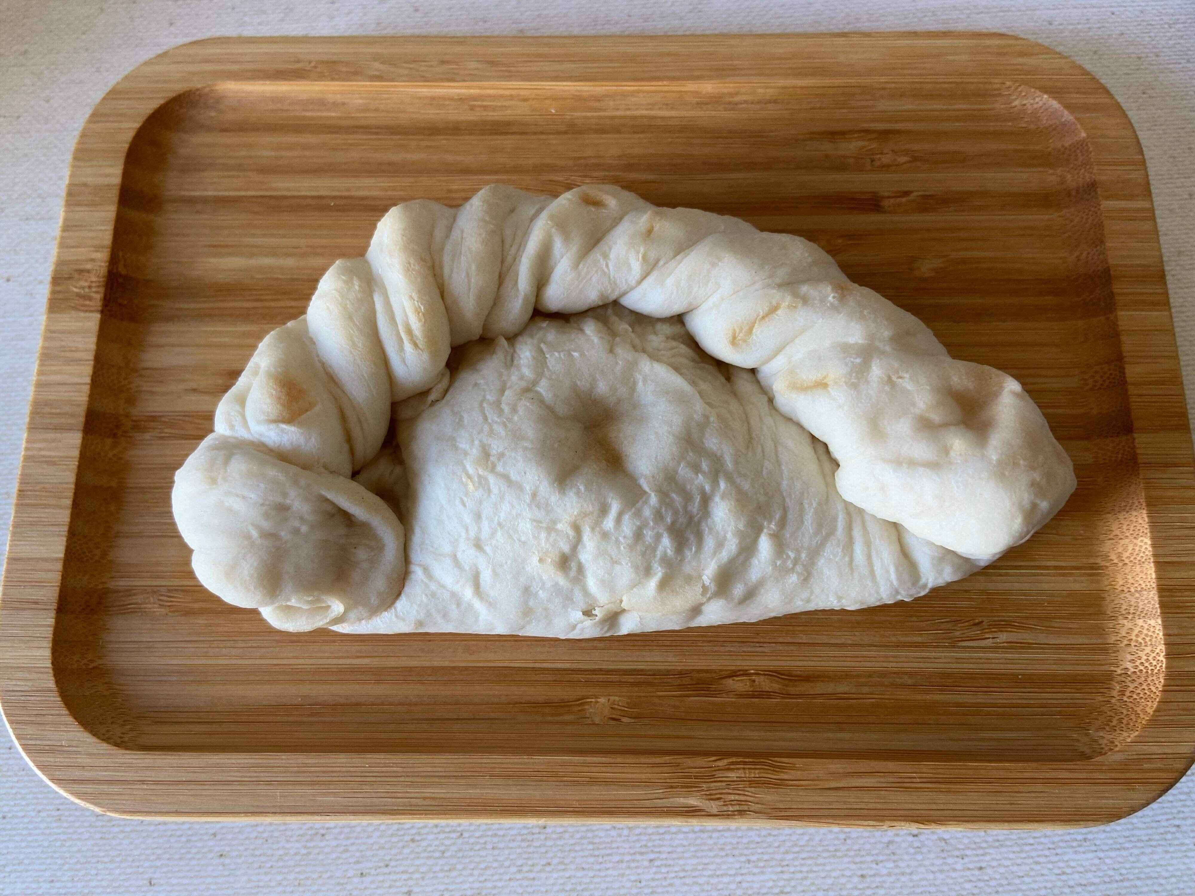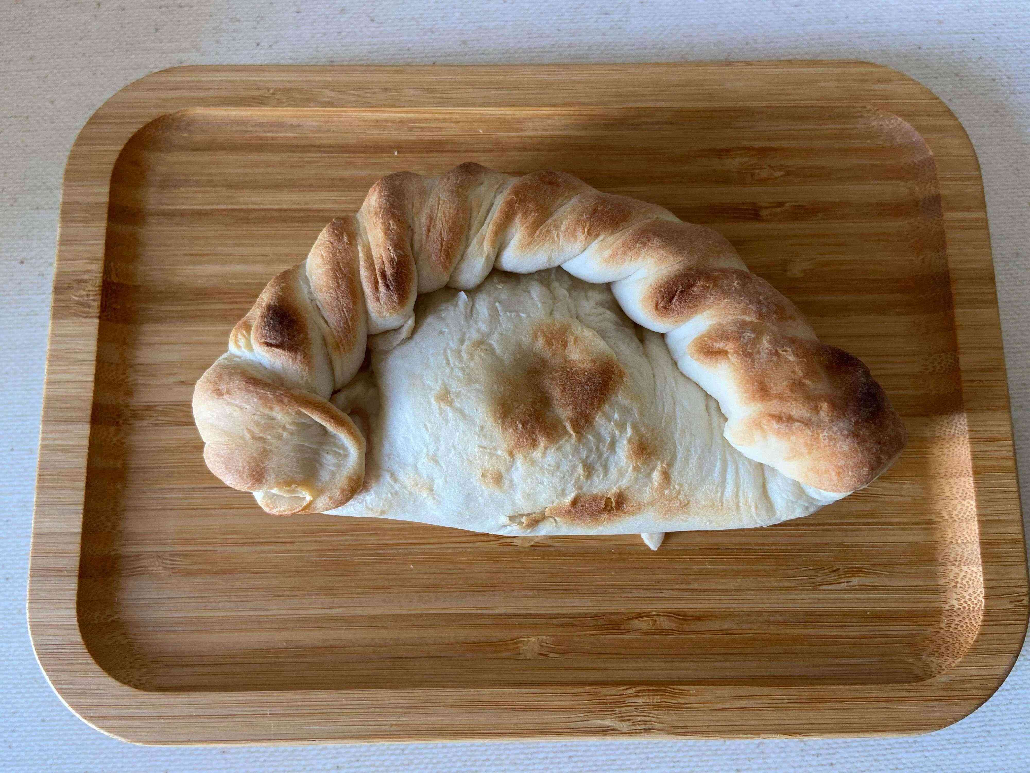 袋から取り出すと、三日月型のカルツォーネが。巻き込んである部分に特徴があるので、見た目のインパクトもありますね。