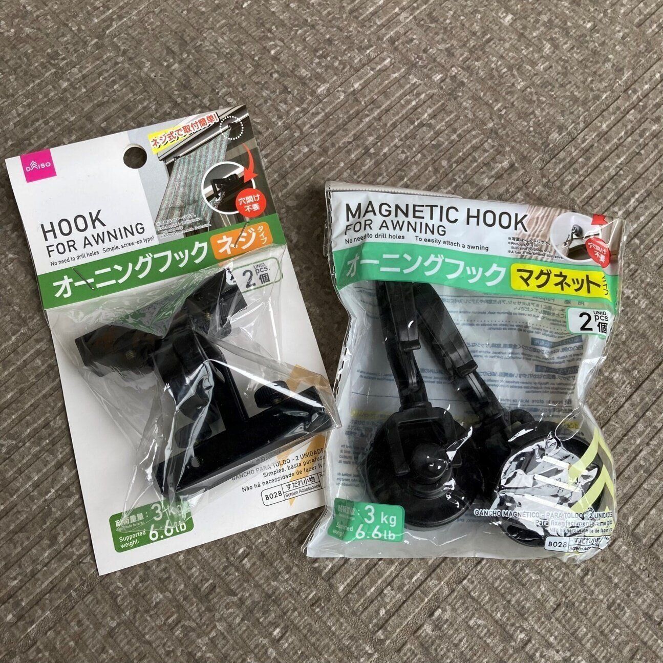 ダイソーの「オーニングフック」は、ドアサッシにサンシェードを簡単に取り付けられるグッズです。ネジ式とマグネット式どちらも2個セットで110円です。