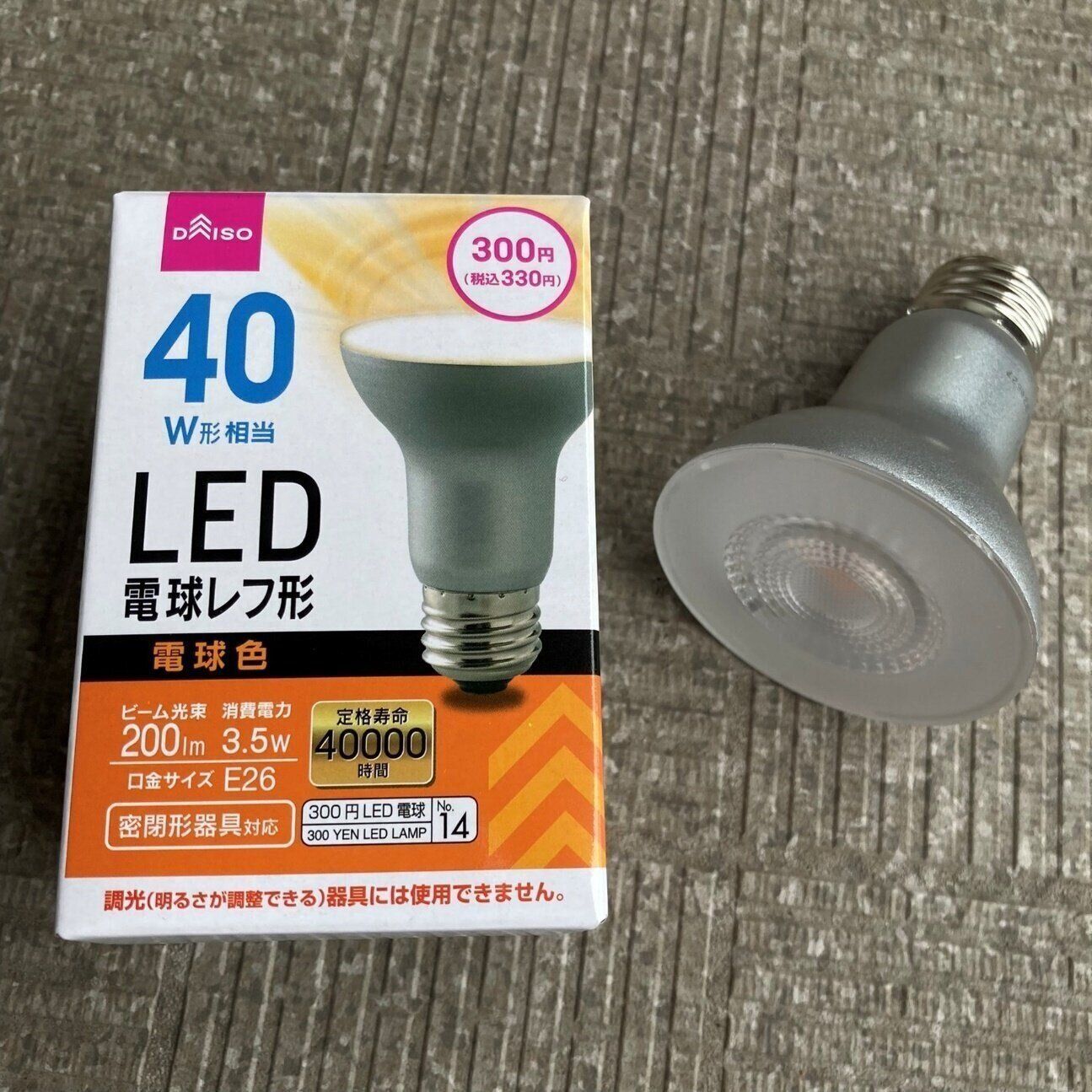 じつは、数年前からダイソーでもLED電球を販売するようになったんです。ふつうの電球型を始め、複数の形状が販売されており、今回は「40W形相当 LED電球レフ形」(330円)にしてみました。
