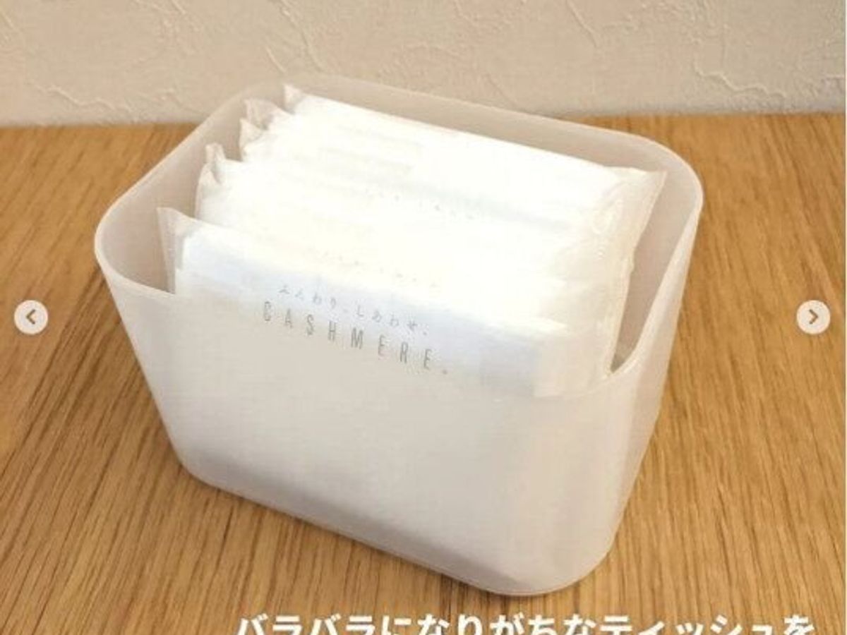 写真でご紹介している「ポリプロピレンメイクボックス 1/2横ハーフ」150円は、メイク道具はもちろん、ポケットティッシュの収納にもピッタリ!色々なアイデアで、素敵な収納を作ってみましょう。