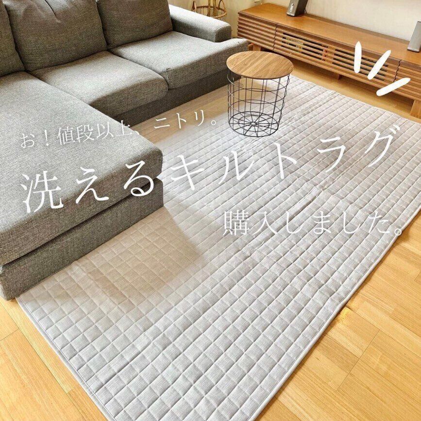 リビングに敷くラグはデザインも生地の心地よさも重要ですよね。ニトリの『洗えるキルトラグ』(2,990円~)なら、どんな部屋にも合うシンプルなデザインに加え、サラっとしていて肌心地がいいので、素足で歩いても気持ちがいいです。表生地は抗菌防臭加工になっており、洗濯機で丸洗いOKなので清潔で安心です。