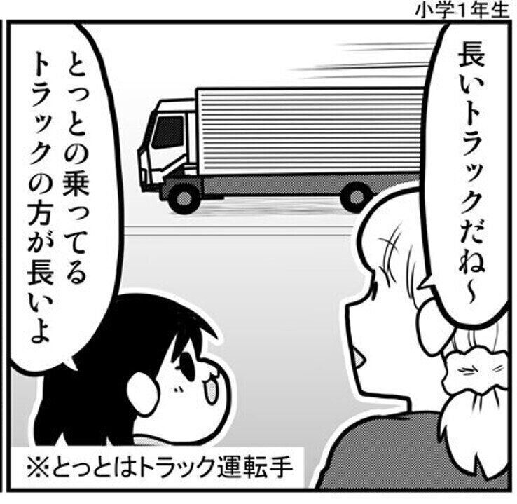 長いトラックを見て「とっとの乗ってるトラックの方が長いよ」とコメントする娘さん。娘さんは以前トラックの写真を見せてもらったと言うのですが……。