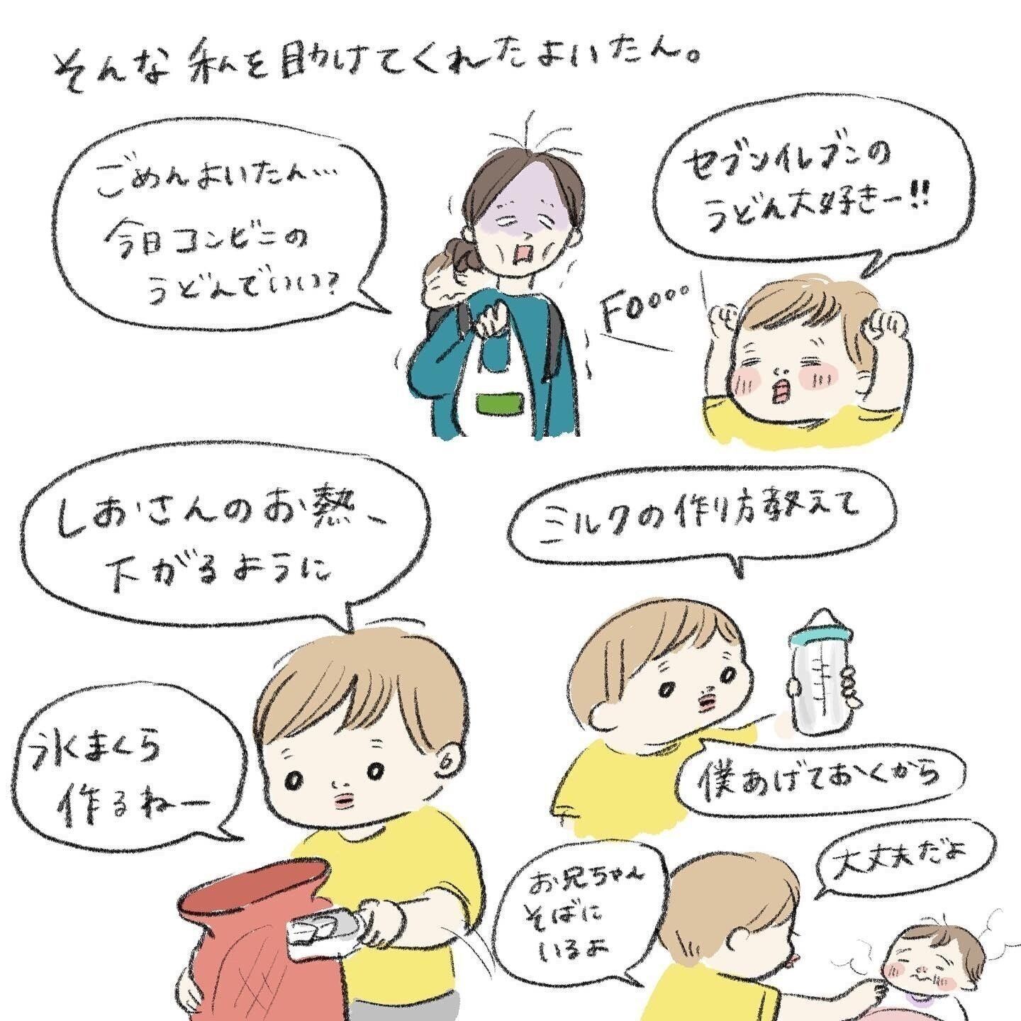 子どもが病気になると、心配と看病で追いつめられたような気分になりますよね。よいたんは、まぼさんが大変そうにしている様子を察して、お手伝いをしてくれたのでしょうか。