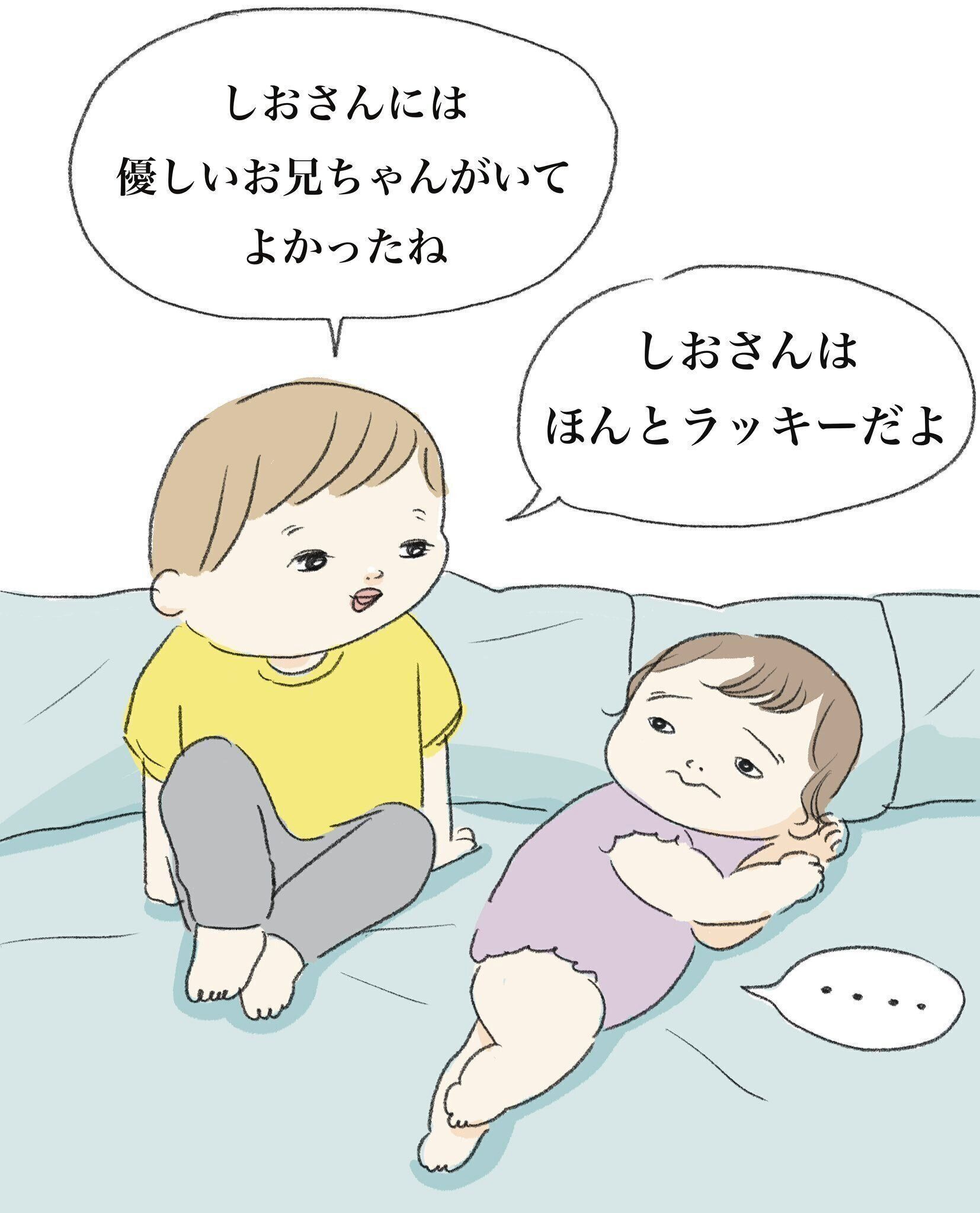 妹・しおさんに向かって、「しおさんには優しいお兄ちゃんがいてよかったね」「しおさんはほんとラッキーだよ」と言い聞かせている兄・よいたん。
