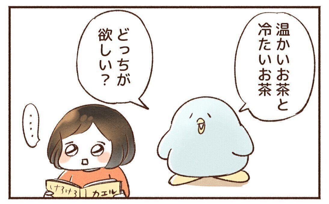 絵本を読む娘さんに「お茶いる?」とたずねたぴぴまるさん。