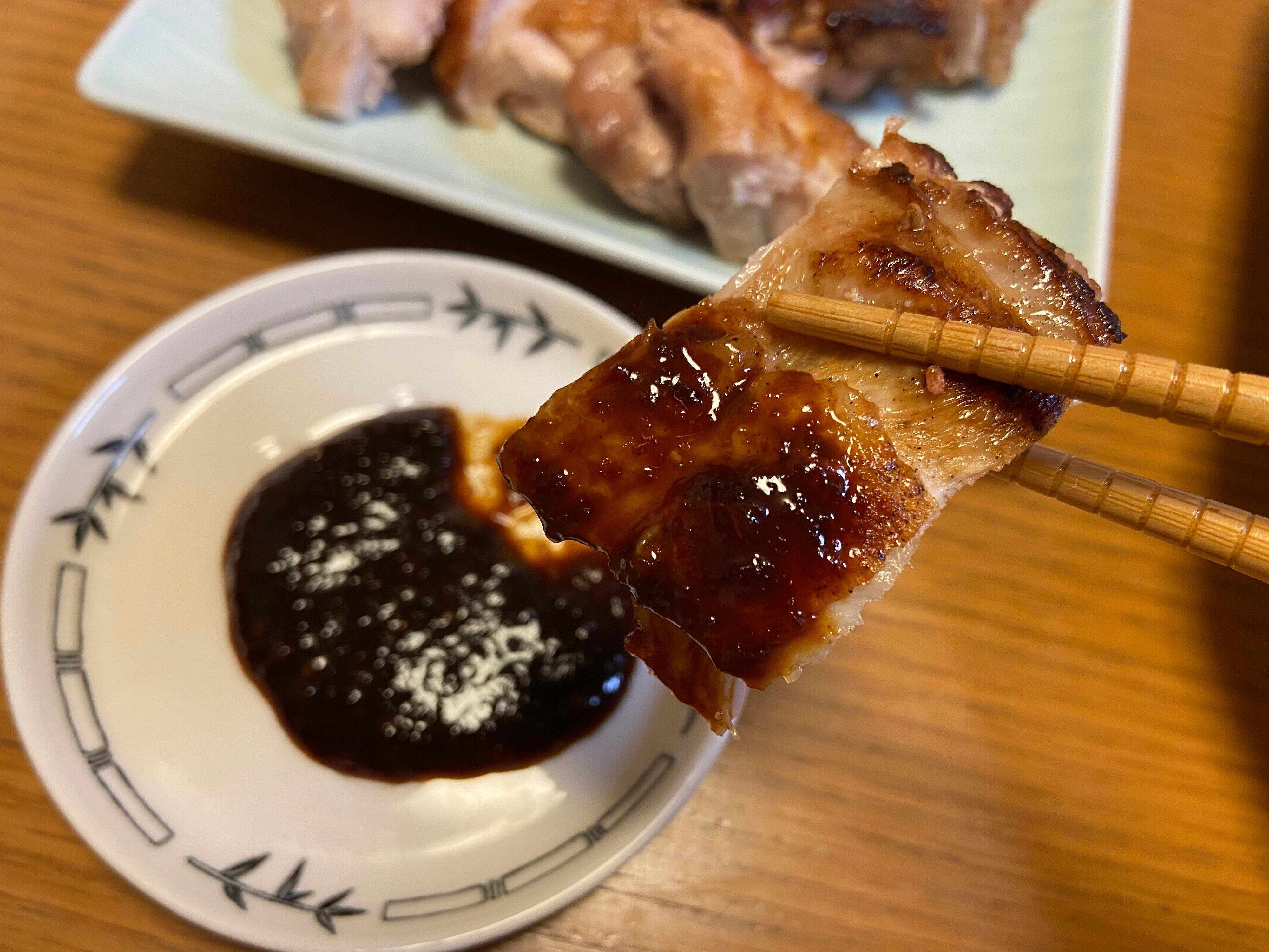 焼いた鶏もも肉にも合わせてみました。これも抜群の相性!甘みのあるたれが鶏肉にしっかりと絡んで、やみつきになる味わいです。