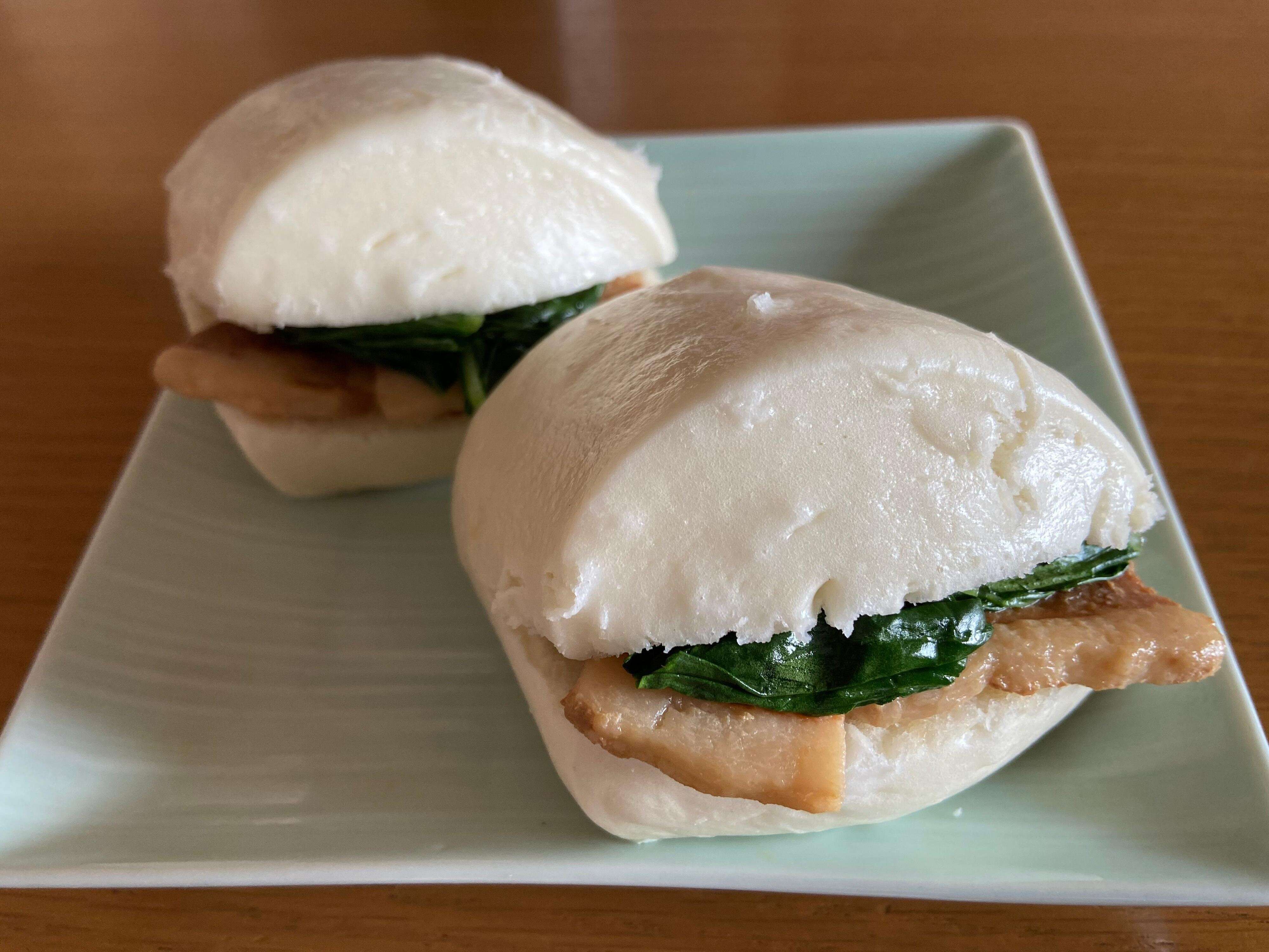 中華饅頭といえば、やはり角煮をはさみたい!豚バラを甘辛くトロトロに煮込んで、茹でた小松菜と一緒にサンドしました。