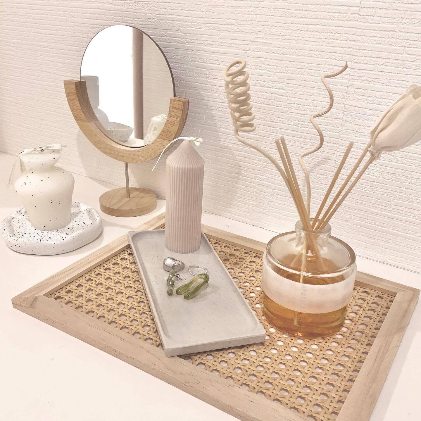細々した小物はカゴメ編みのトレイに乗せてインテリアの格上げを