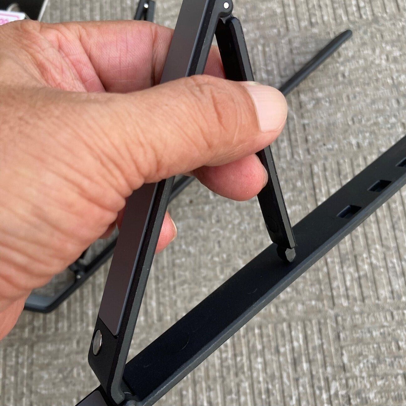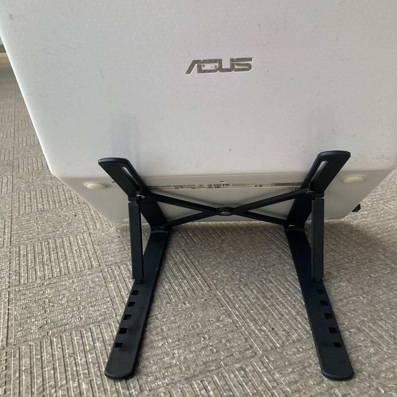 手に持つとプラスチックのような質感で脆そうに感じますが、1.5kgまでのノートパソコンやタブレットまでなら問題ないと説明に書かれています。自宅のノートパソコンを乗せてみましたが、安定しているので軽量なパソコンなら問題ないと思います。
