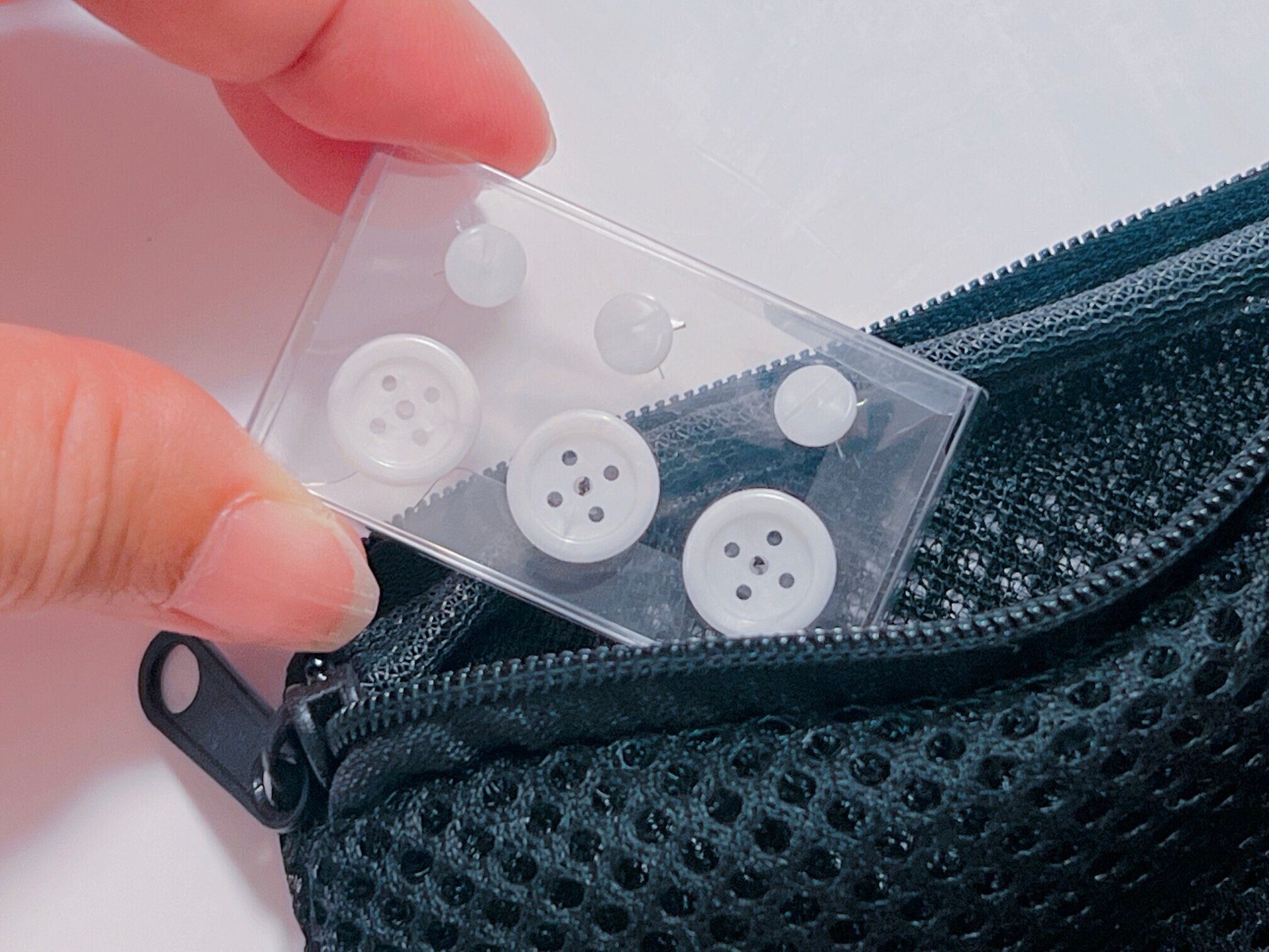 ケースが付いているので、バッグの内ポケットやポーチの中に入れて持ち運びしやすいです。大切な打ち合わせの前にボタンが外れてしまっても、驚きの速さでボタン付けができるので、もしもの場合に備えて持ち歩いていると心強いです。