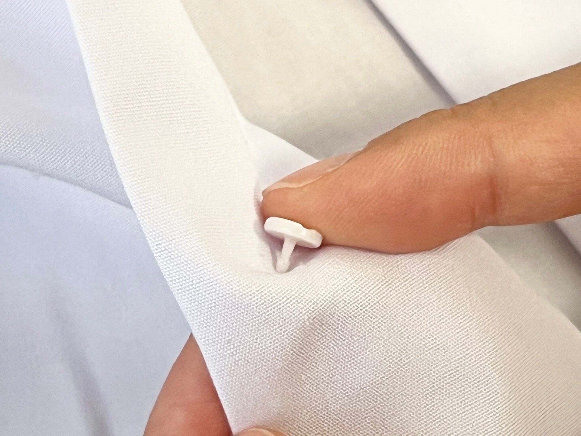 1.ボタンを取り付けたい箇所の下からピンを刺します。生地が厚い場合は、目打ちなどで事前に穴を開けてから使用してください。
