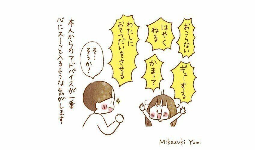 ミカヅキユミさん(@mikazuki_yumi)が「育児に悩んだら、本人に相談するのもいいかもしれない」というコメントとともにTwitterにイラストを投稿。驚きの発想にいいねが集まっています。作者のミカヅキユミさんにお話をうかがいました。
