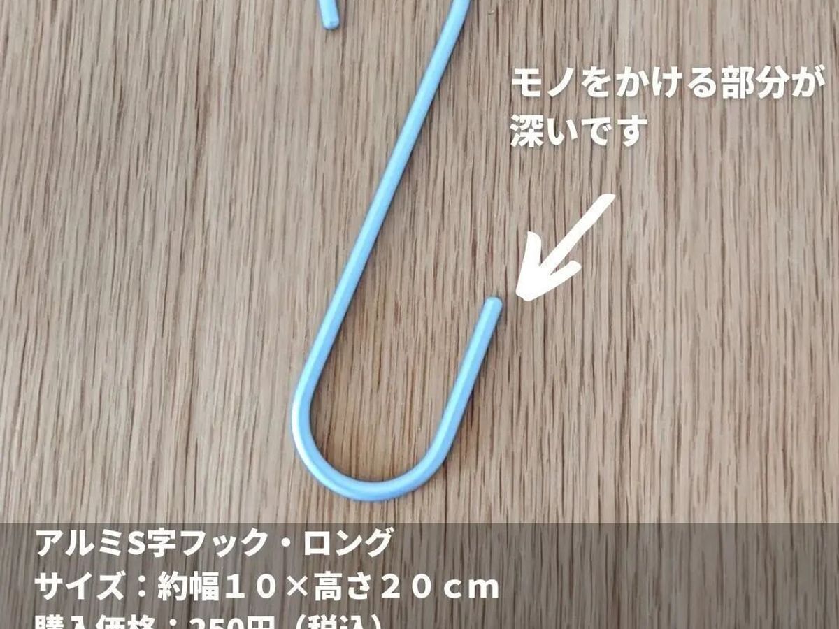 「アルミS字フック・ロング」(250円)は、ふしぎな形のS字フックです。注目は、下のものをかけるところが、深くなっているのがポイント。この深さのおかげでものが落ちにくくなっています。