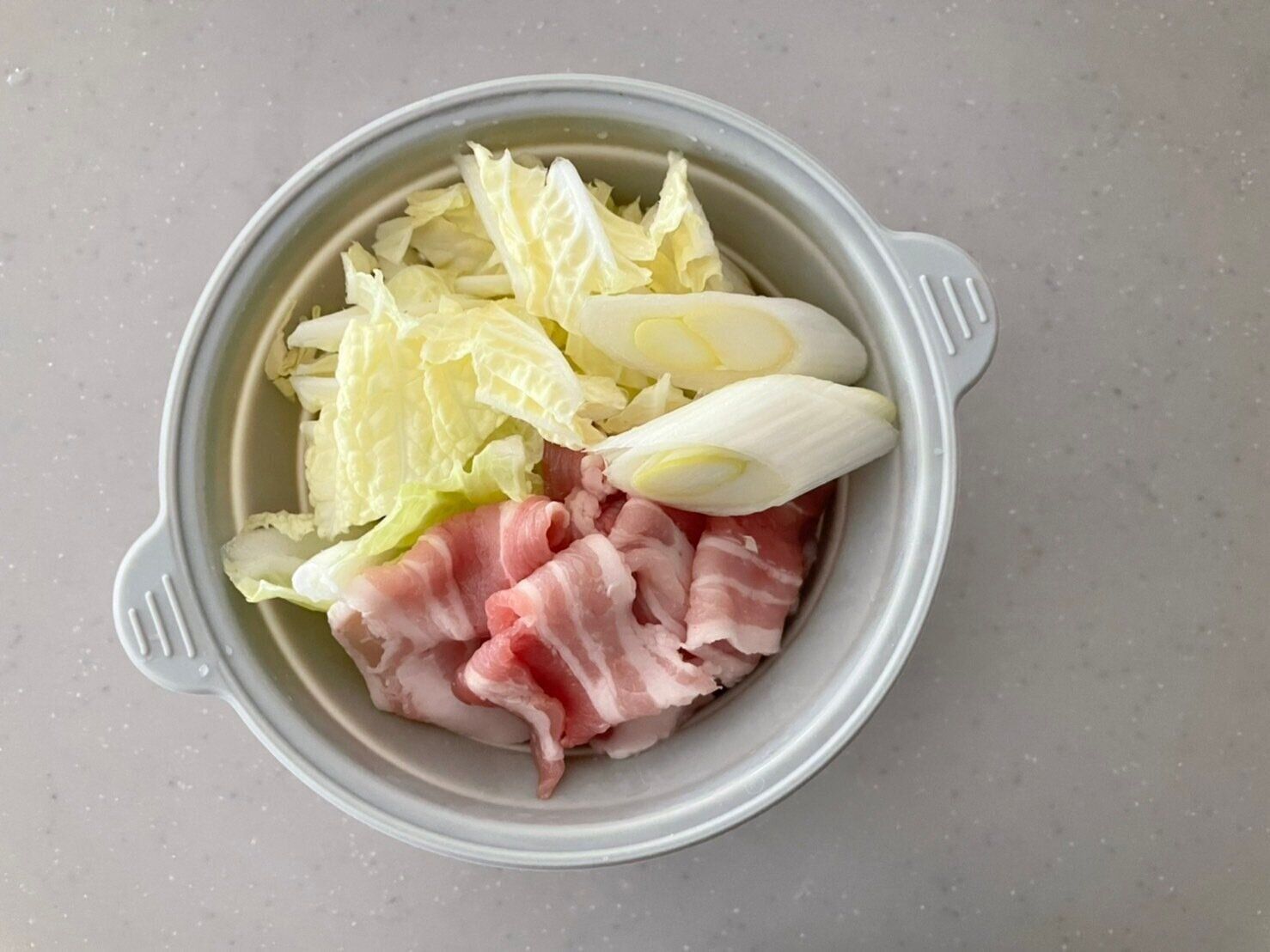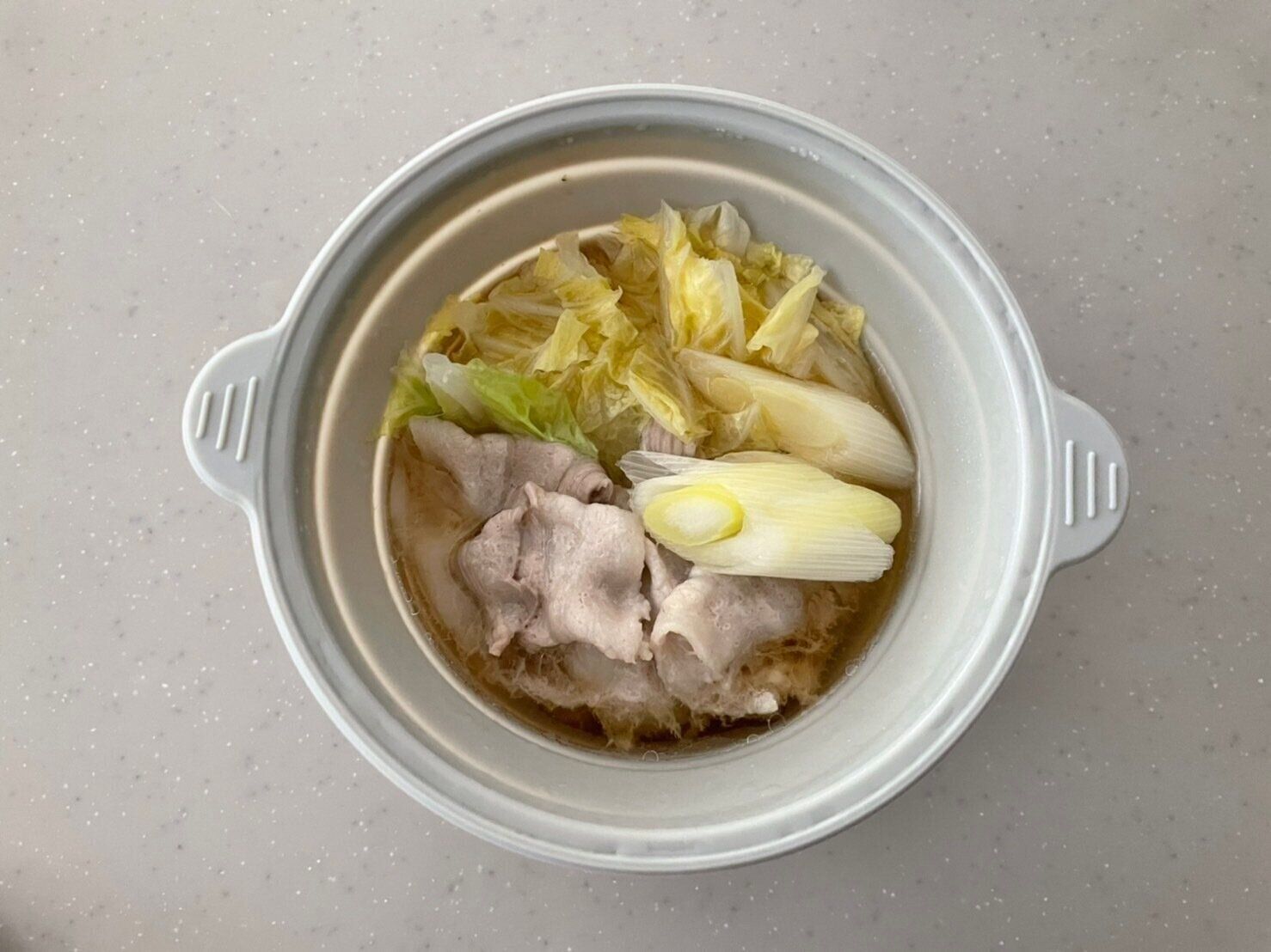 この小鍋を使って、実際に鍋料理をつくってみました。材料は、白菜とネギ、豚肉と鍋の素のみ!600Wの電子レンジで5分温めるだけで調理完了です。