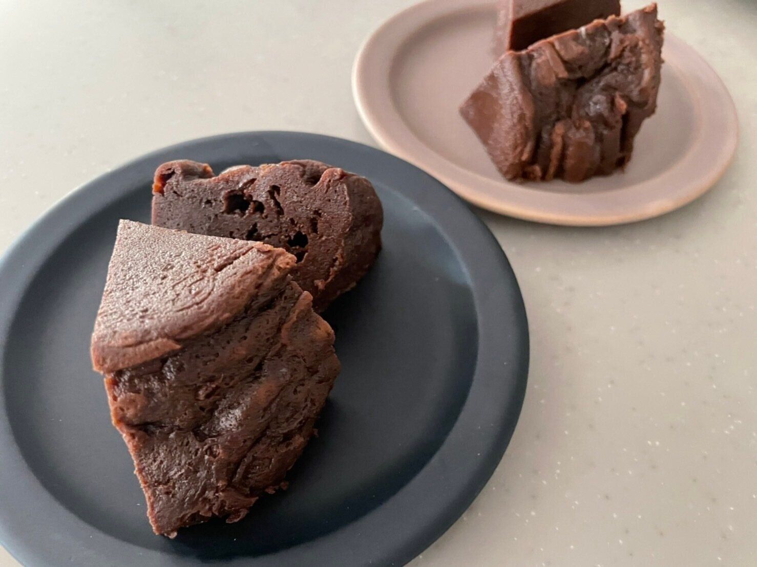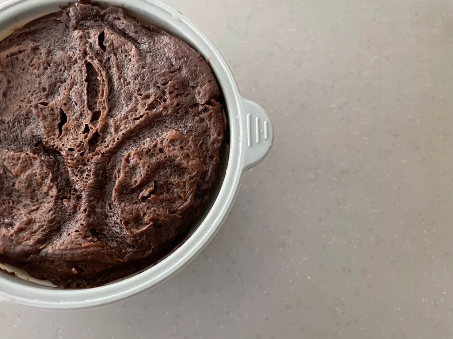 材料をシリコーン小鍋に投入し600Wで5分加熱すると、ふっくらチョコケーキが焼きあがりました。時間がなくても、簡単に手作りおやつが食べたいときに便利ですよ。