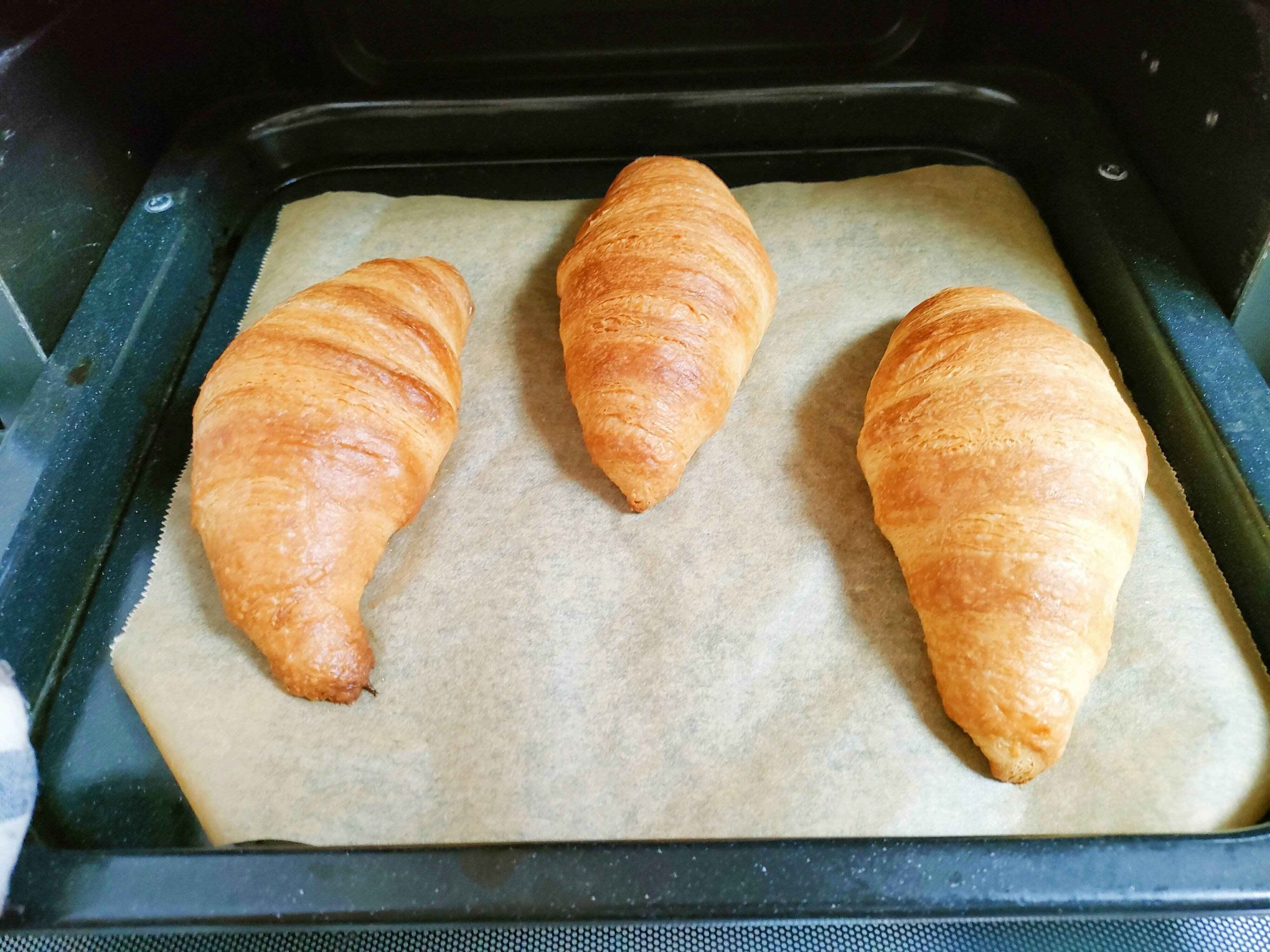 しっかり解凍しないまま焼きに入ってしまうと、最後まで膨らみません!時間を守らないと、ふんわり感のない残念なクロワッサンが焼き上がってしまいますね…。