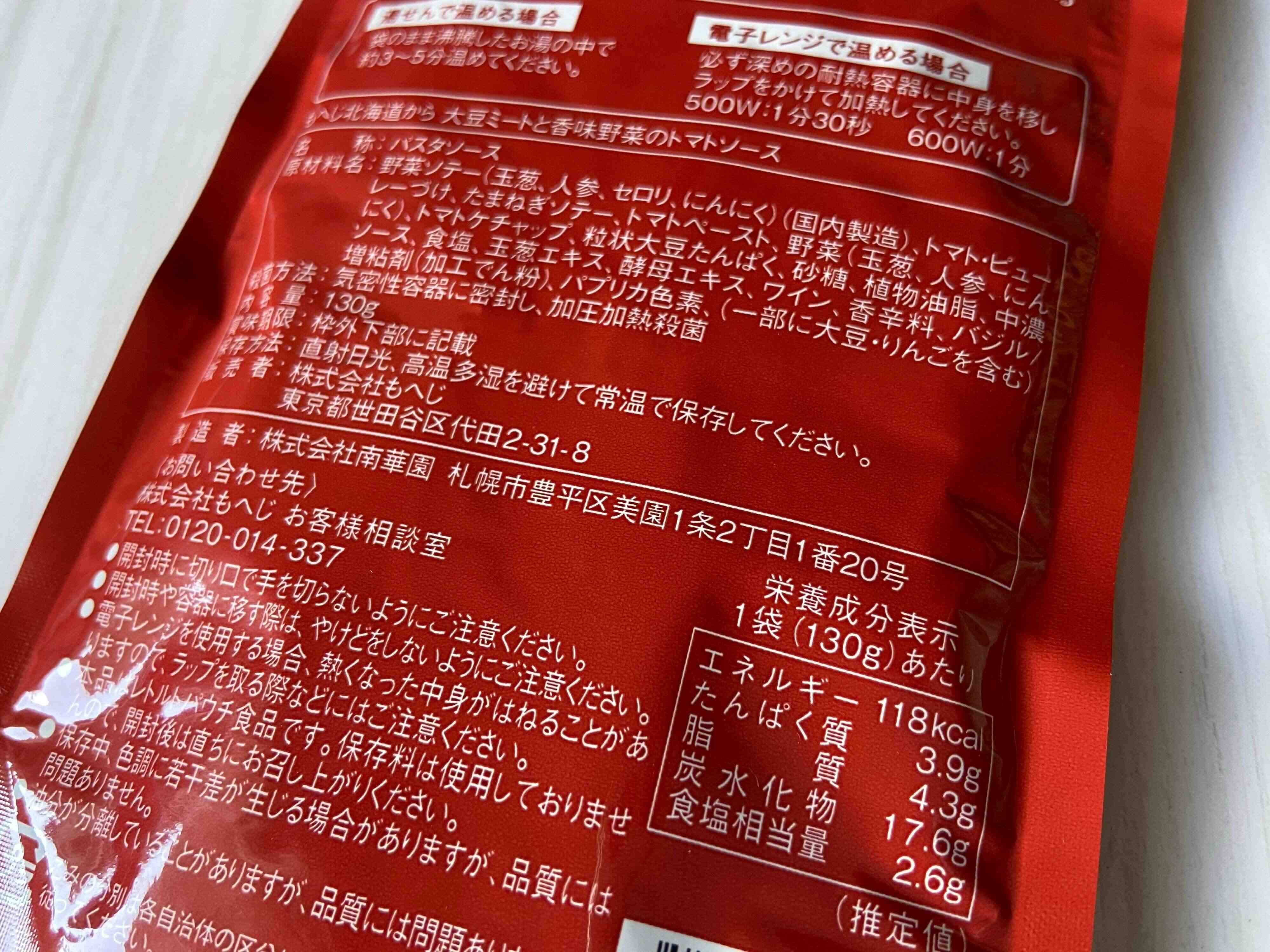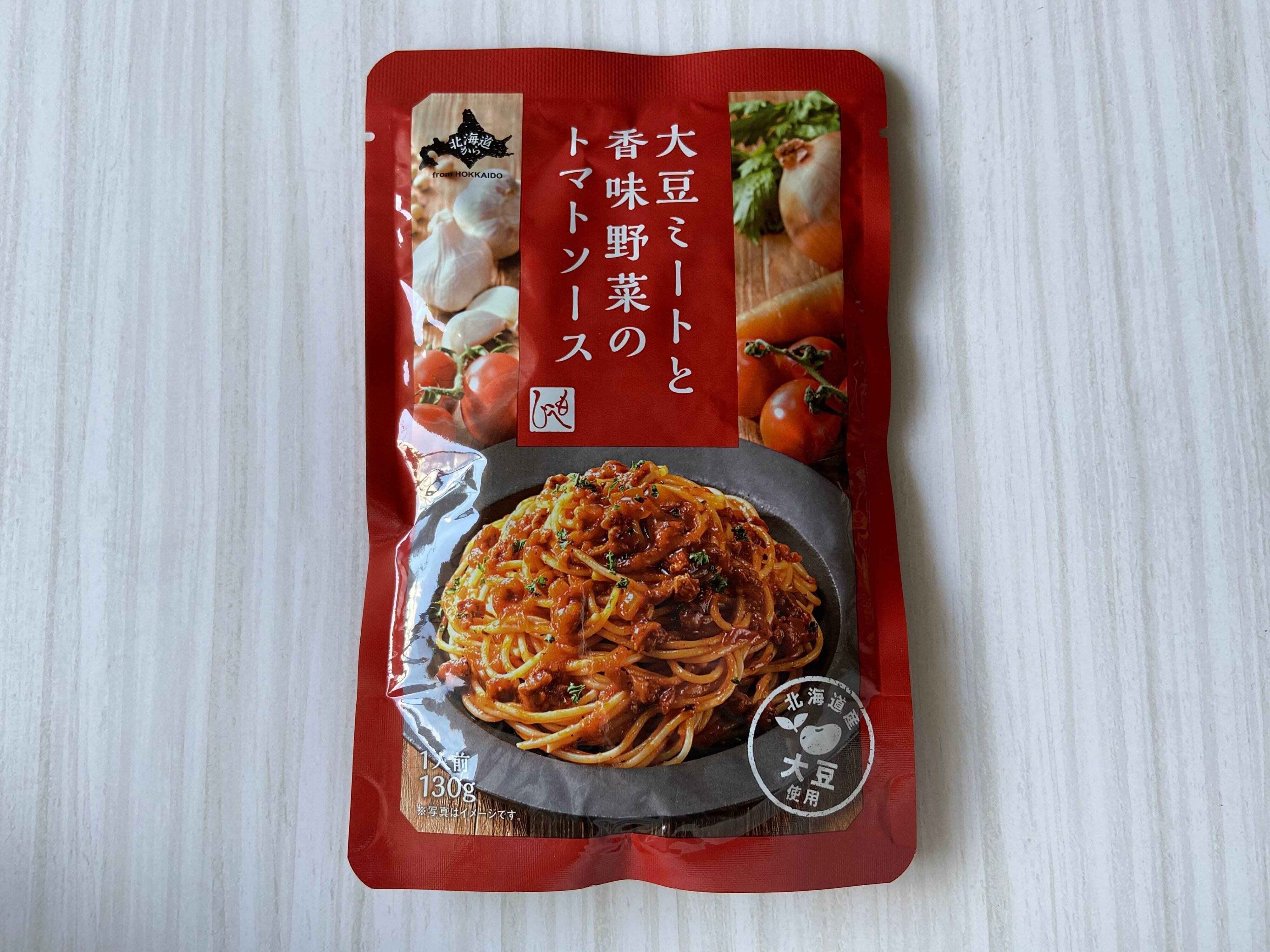 カルディでもここ数年、大豆を使った商品が多く店頭に並ぶようになりました。筆者が一度購入し食べてみて、そのおいしさにリピート購入するようになったのは「北海道から 大豆ミートと香味野菜のトマトソース」(購入時:298円)という商品。