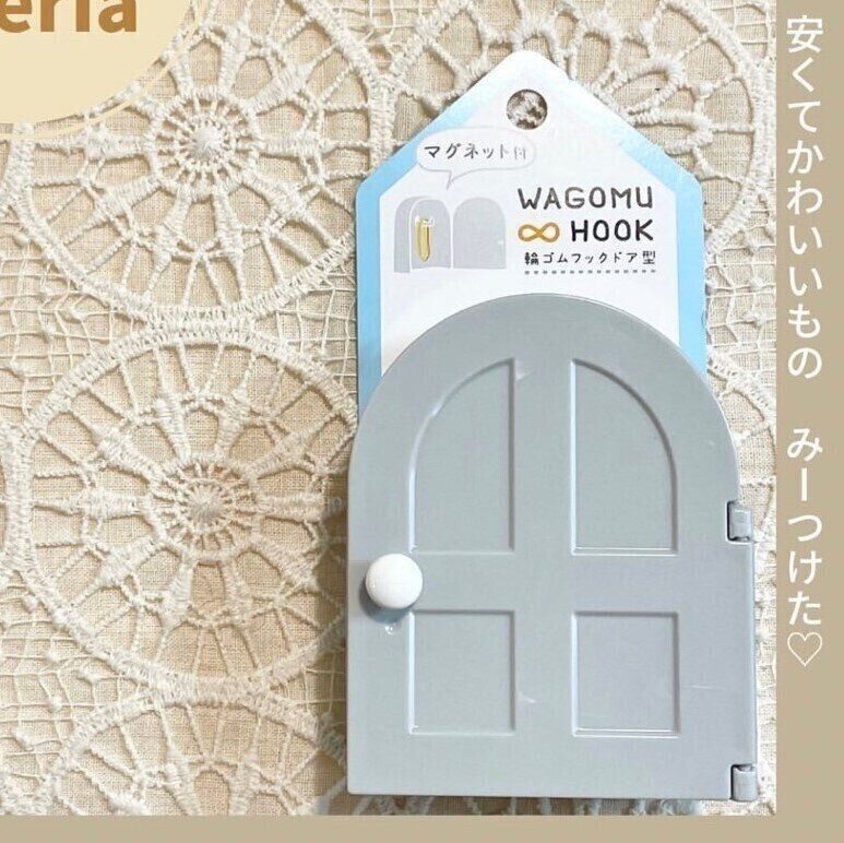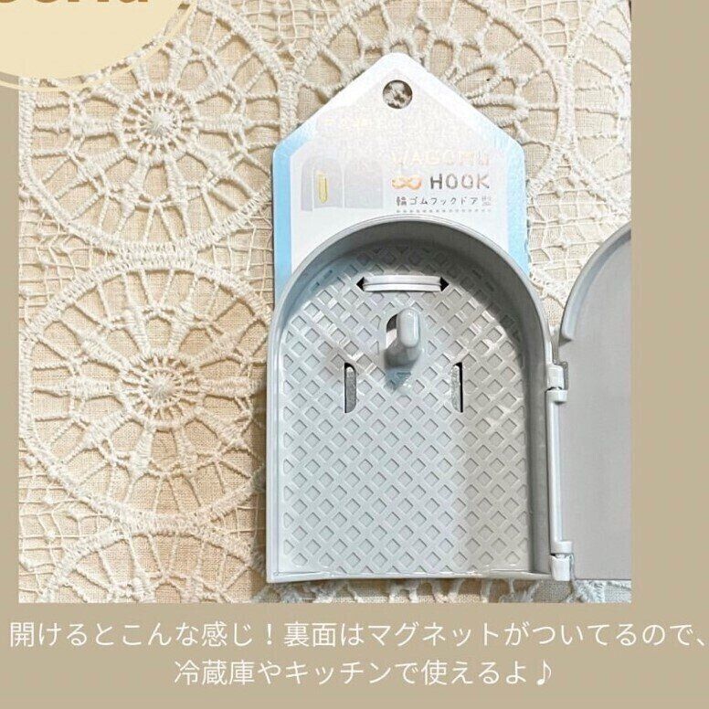 フックがついていて輪ゴムの収納ができるのです。どうしても生活感が出てしまう輪ゴムの収納。こちらの『輪ゴムフックドア型』(110円)があれば、かわいく収納できちゃいます。裏面にはマグネットがついてるので、冷蔵庫などに貼りつけておけます。心づかいまでステキな商品です。
