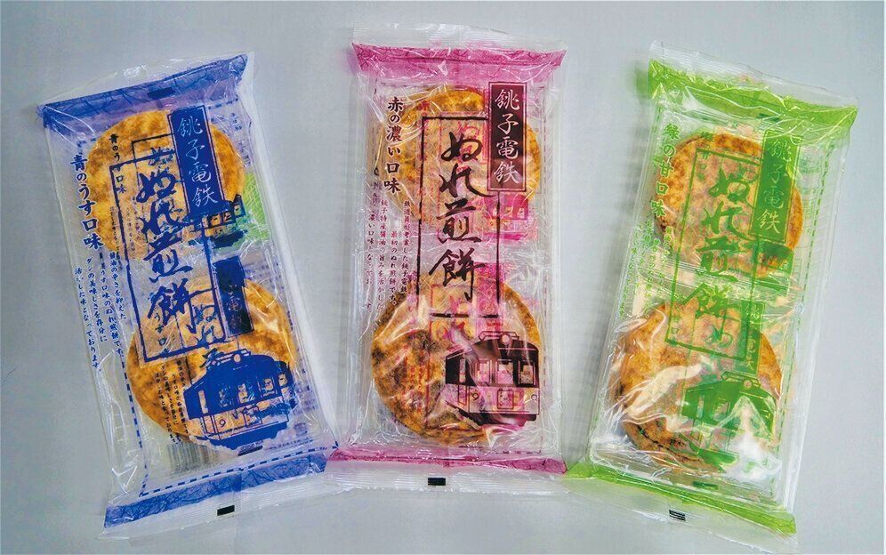 経理課長が自社HPに書いた「ぬれ煎餅買ってください!!電車修理代を稼がなくちゃ、いけないんです」という叫びが「2ちゃんねる」でバズり大ヒット。(左から)「青の薄口味」、「赤の濃い口味」、「緑の甘口味」5枚入り各500円。