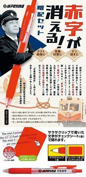 コロナ禍での乗客減少時、何とか赤字を消したいという願いを込め、赤ペンとシートをセット販売。倒産の危機を何度も乗り越え走り続けてきた銚電の強運をお裾分けする縁起物。500円。