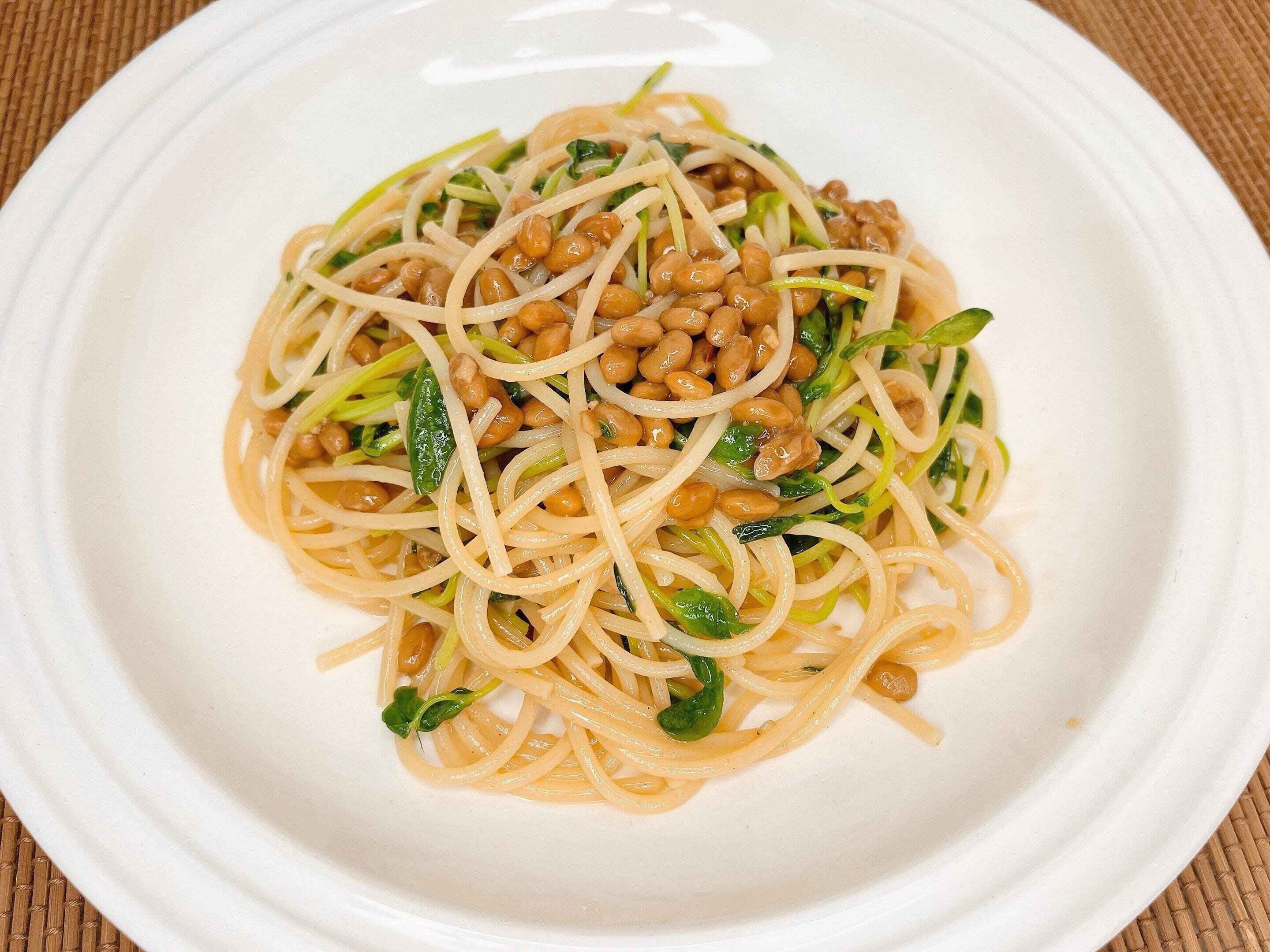 冷蔵庫に入っている残り物や余っている食材を具材にし、塩コショウで炒め、茹でたパスタを加え、最後に旨たれをお好みで適量入れ、味付けしたら完成です。今回は残り物の豆苗と納豆を使用したパスタにしてみました。