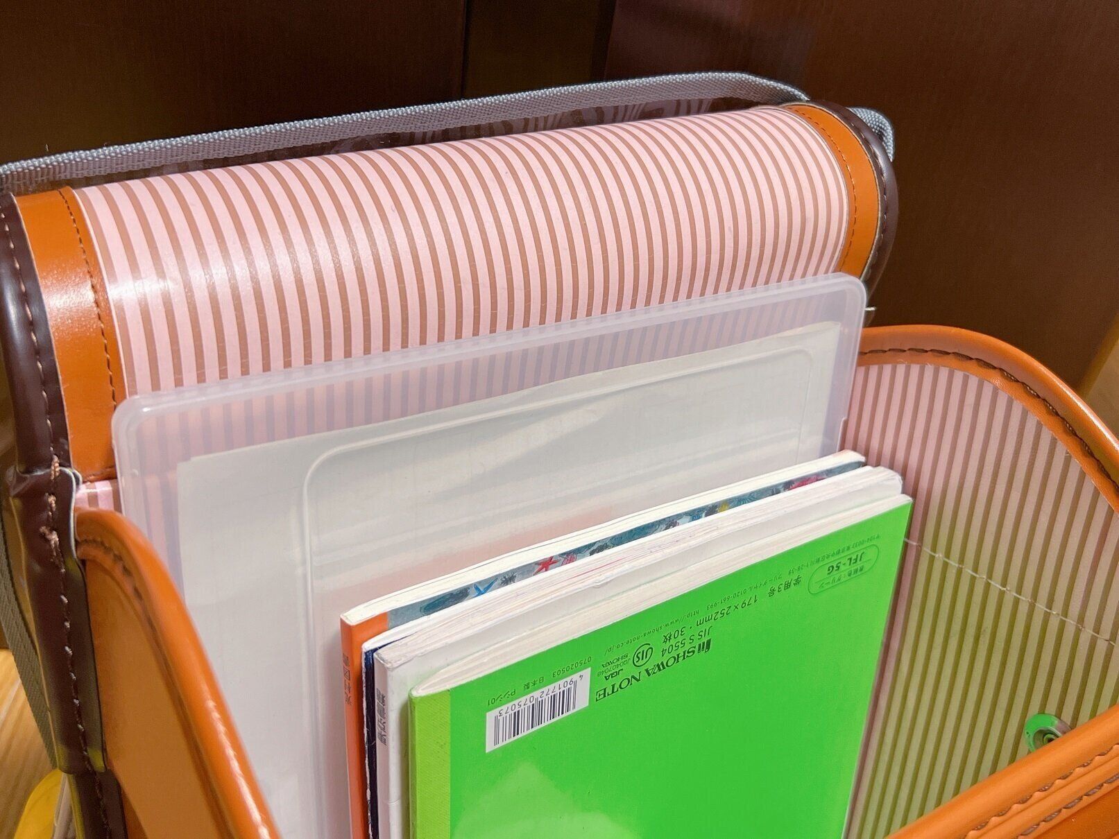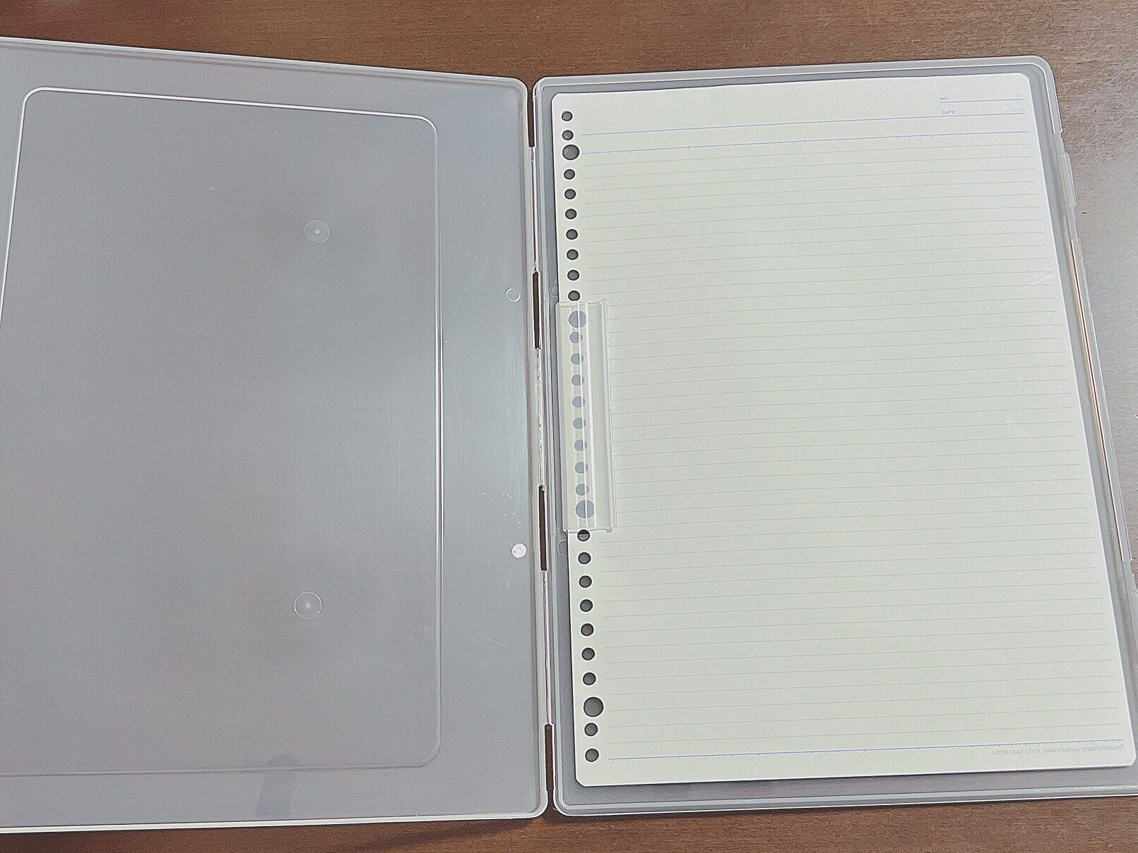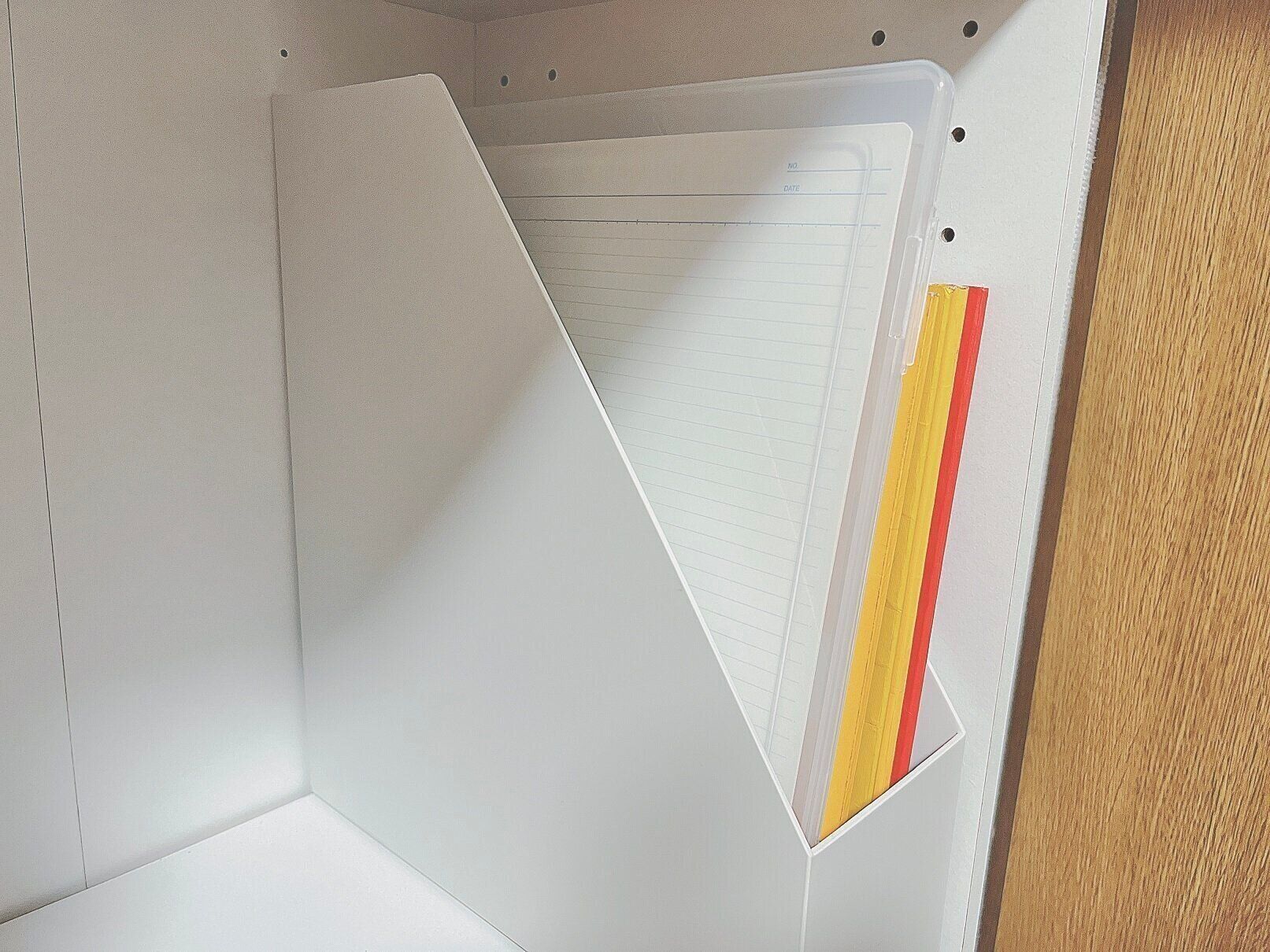 ルーズリーフや便せんなど袋のままだと本棚などに立てて収納しづらいけれど、ケースに入れたら、折れずに収納でき、また取り出しやすくもなります。