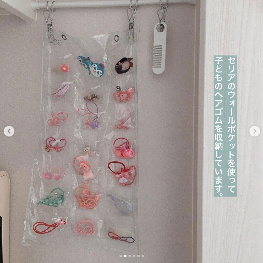 朝はとにかく時間との戦い。子どものいるご家庭では、とくに1分1秒が大切ですよね。tsuu_kurashiさんは子どものヘアゴムをセリアのウォールポケットを使って収納しているそうです。クリアで中身が全部見えるので、パッと選べてさっと使えるのがいいですね!
