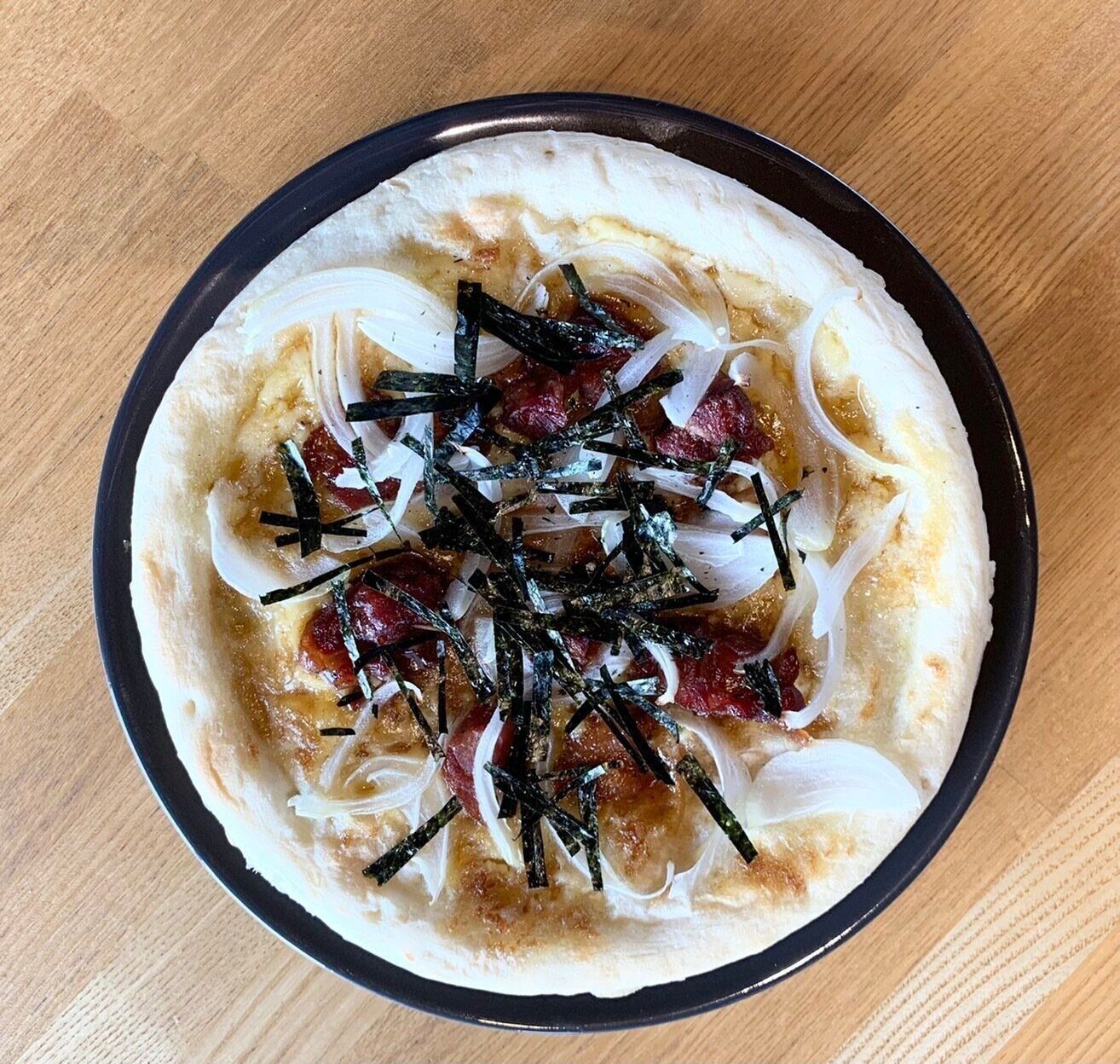 生地にマヨネーズを塗り、缶詰の焼き鳥、玉ねぎを乗せて先程と同じく設定で焼きます。焼けたら食べる前に海苔を散らせば、缶詰焼き鳥の和風照り焼きピザのできあがり!