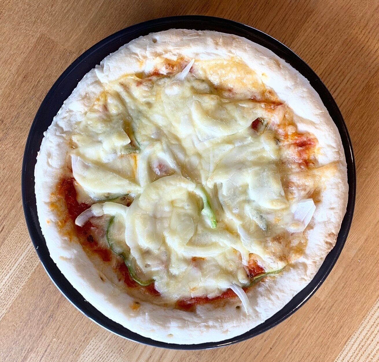 ピザ生地は一見すると小さいようですが、しっかりとした食べ応えがあり、お昼ご飯にピッタリのサイズでした。厚さもちょうどよく、冷蔵庫にある食材で簡単に本格的なピザが楽しめます。