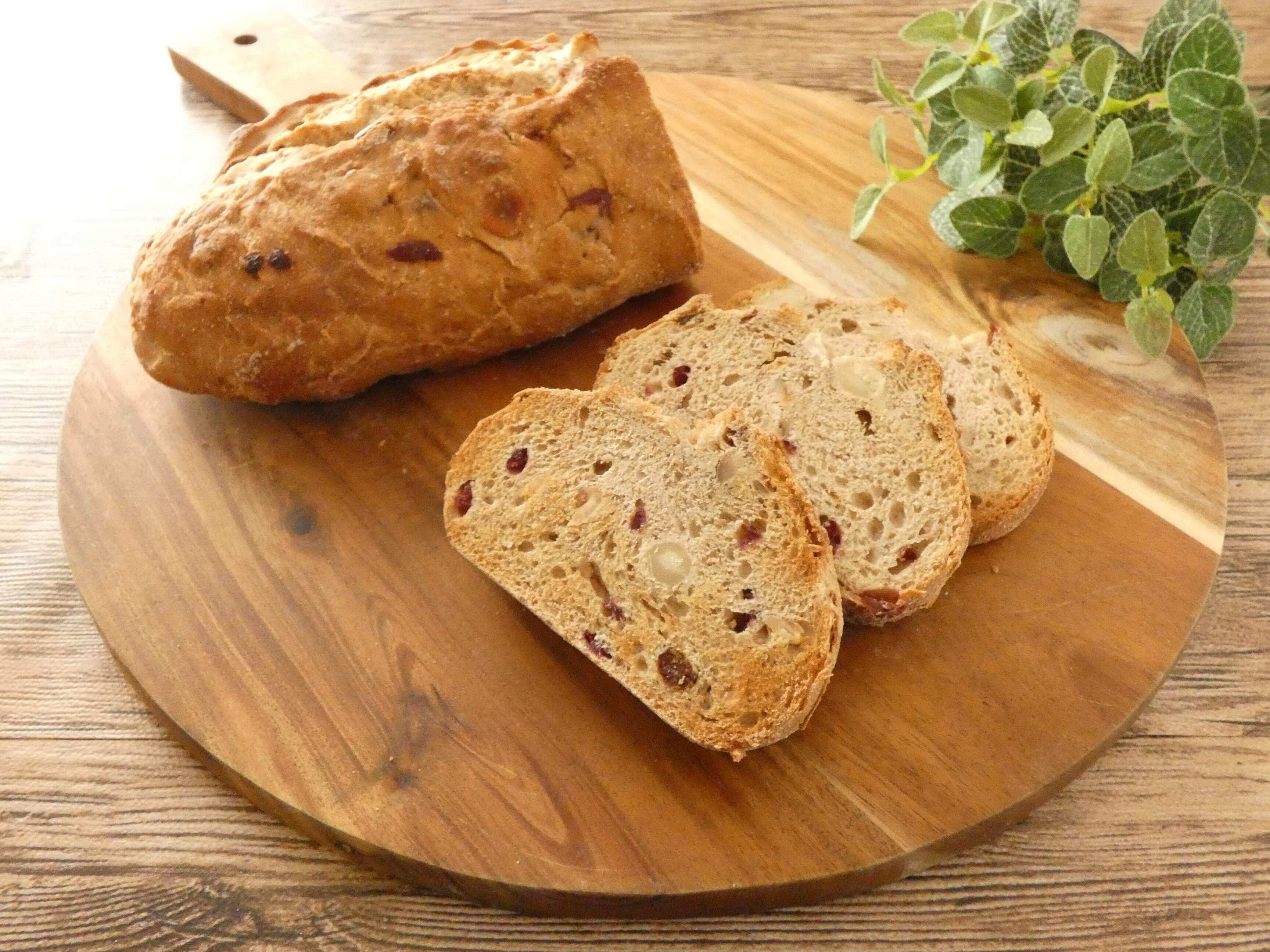 焼きたてだと外はサクサクで中はふんわり。少し時間が経つとむっちりもっちりした感じになります。ドライフルーツの甘さとナッツの食感が良くて、そのままおいしく食べられます。ジャムやクリームチーズをつけてもOK。クリームチーズとの相性バッチリで、止まらなくなるおいしさです。