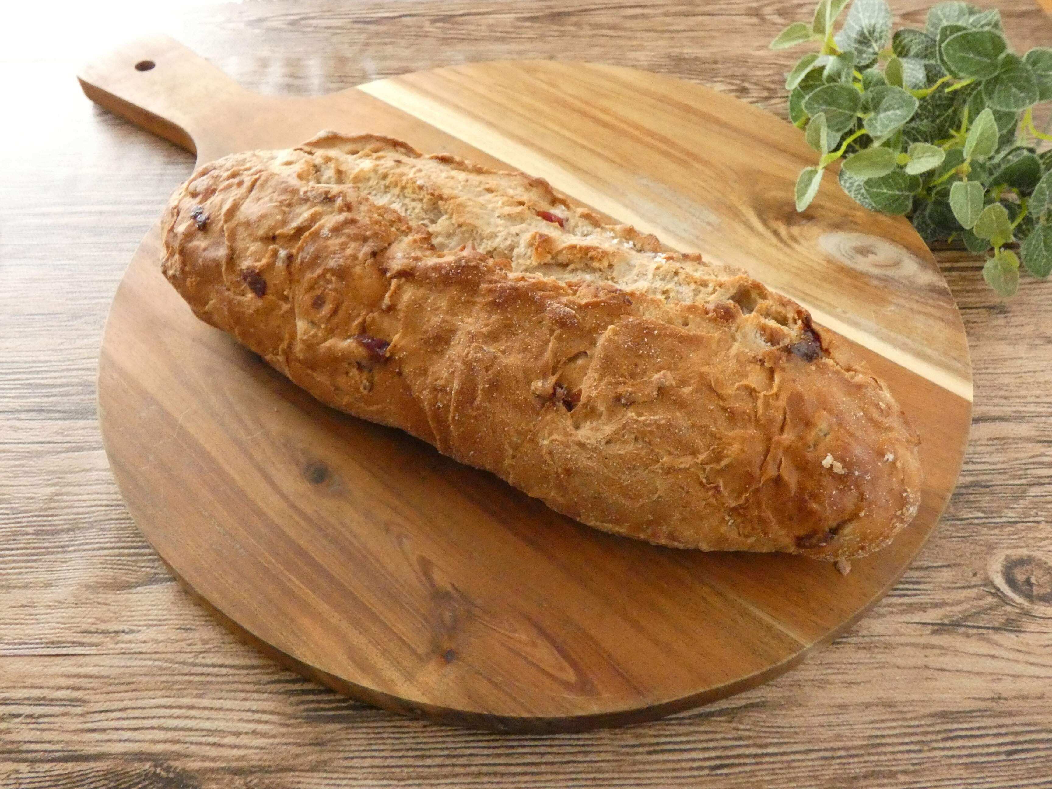 長さ25cmほどの大きめ冷凍パンで、アーモンドなどのナッツとアプリコットやクランベリーが入っています。