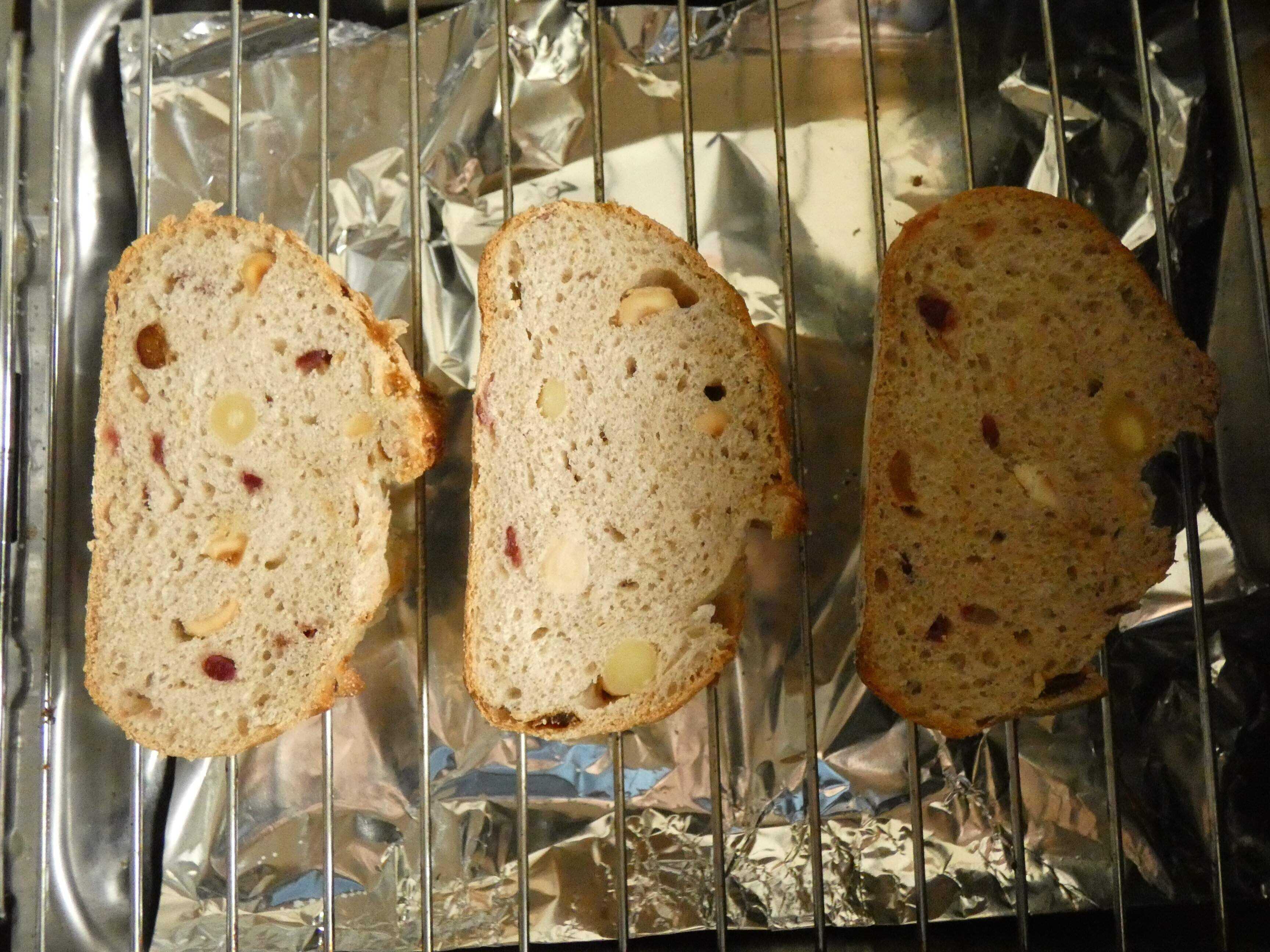 食べるときは冷凍パンを2cmくらいの厚さに切ります。カチカチで切れるかな?と心配しましたが、カットできました。カット面を見るとナッツとドライフルーツがたっぷりなのが分かります。トースターでこんがり焼いたらOK。