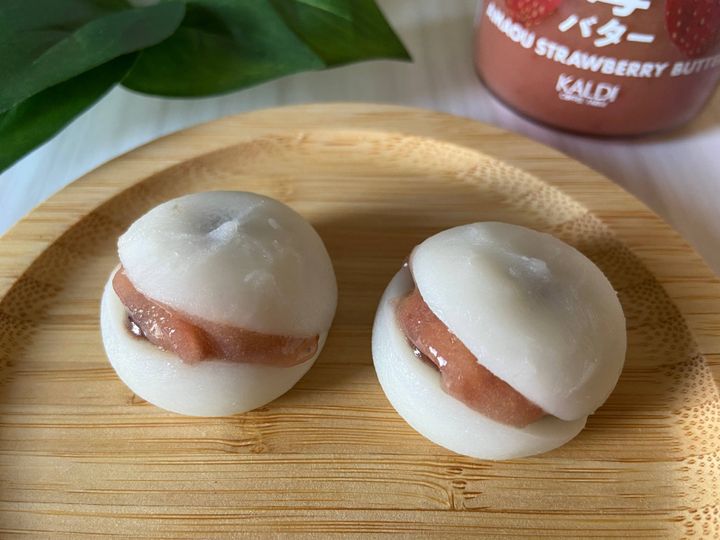 家にあったミニサイズの大福に切込みを入れて、あまおう苺バターをサンドしてみました。思いつきで作ったこのアレンジは大正解のおいしさ!