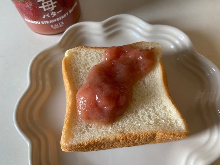 厚切りの食パンにたっぷり塗って食べてみると、ソフトなパン生地にとろとろぷるぷるのあまおう苺バターが相性抜群です。バターが入っていることで酸味もマイルドに、クリーミーになっているからパンとの馴染みもいいんです。