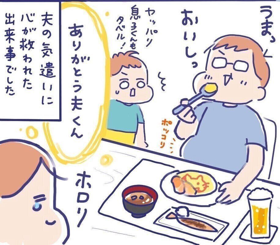 はみだしみゆきさん(@HamidashiMiyuki)がTwitterに投稿した漫画に多数のいいねが集まりました。理不尽な育児に心が折れそうになったとき、すかさず助け舟を出してくれたパパに「ステキな夫さん」「優しい」の声が寄せられています。