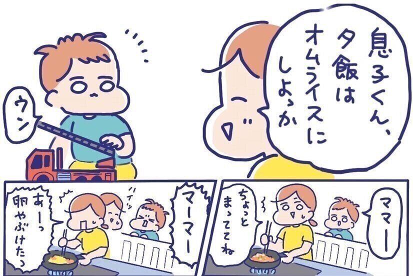 ある日の夕食前。はみだしさんが夕飯のメニューを提案すると、「うん」と答える息子さん。