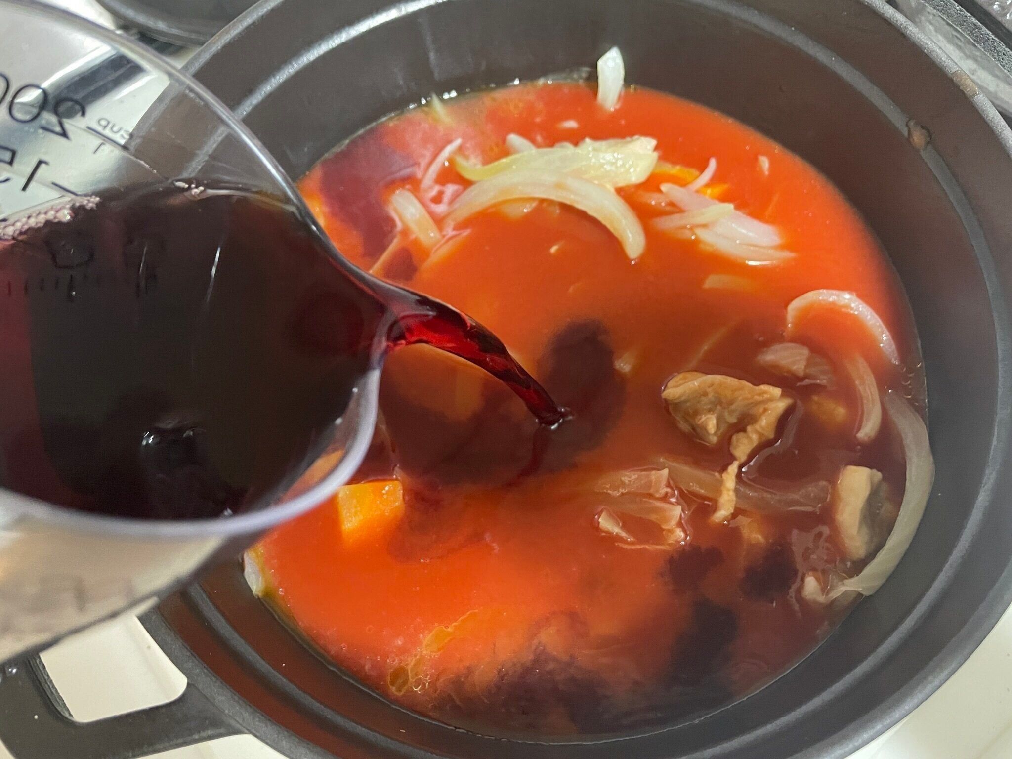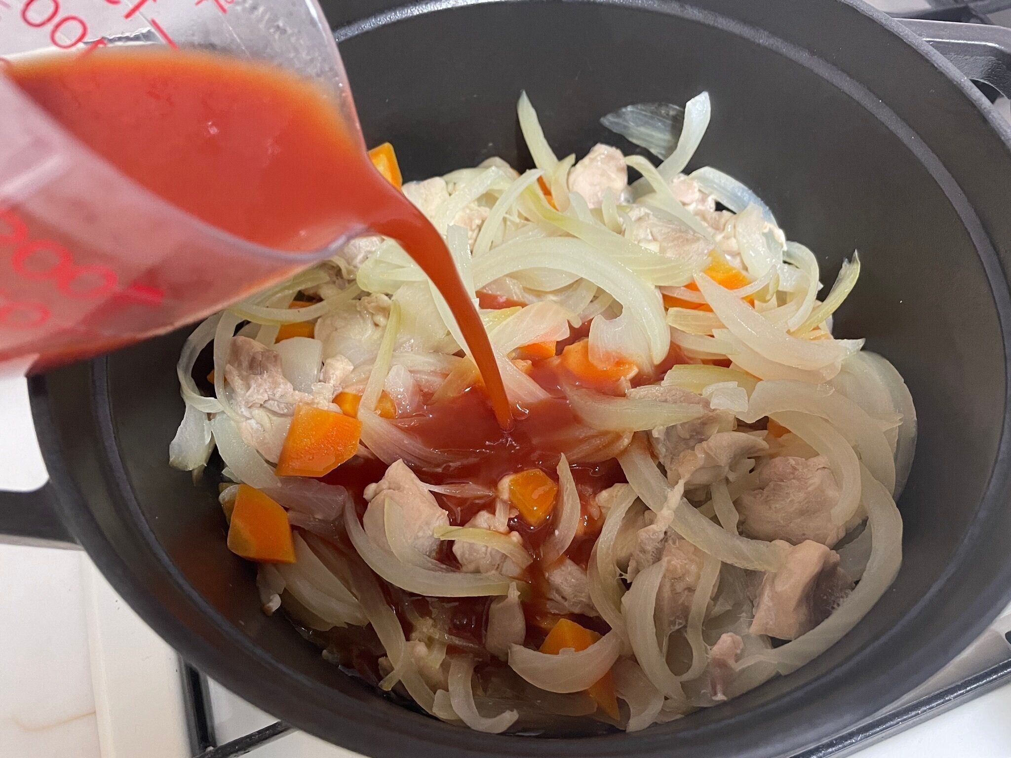 たとえば、1,000ml入れていたトマトジュースを800mlに減らし、赤ワイン200mlを入れます(赤ワインは飲み残しのものなどで十分です)。アルコール分を飛ばすため、仕上げに入れるのではなく、必ず煮込む前に入れてくださいね。