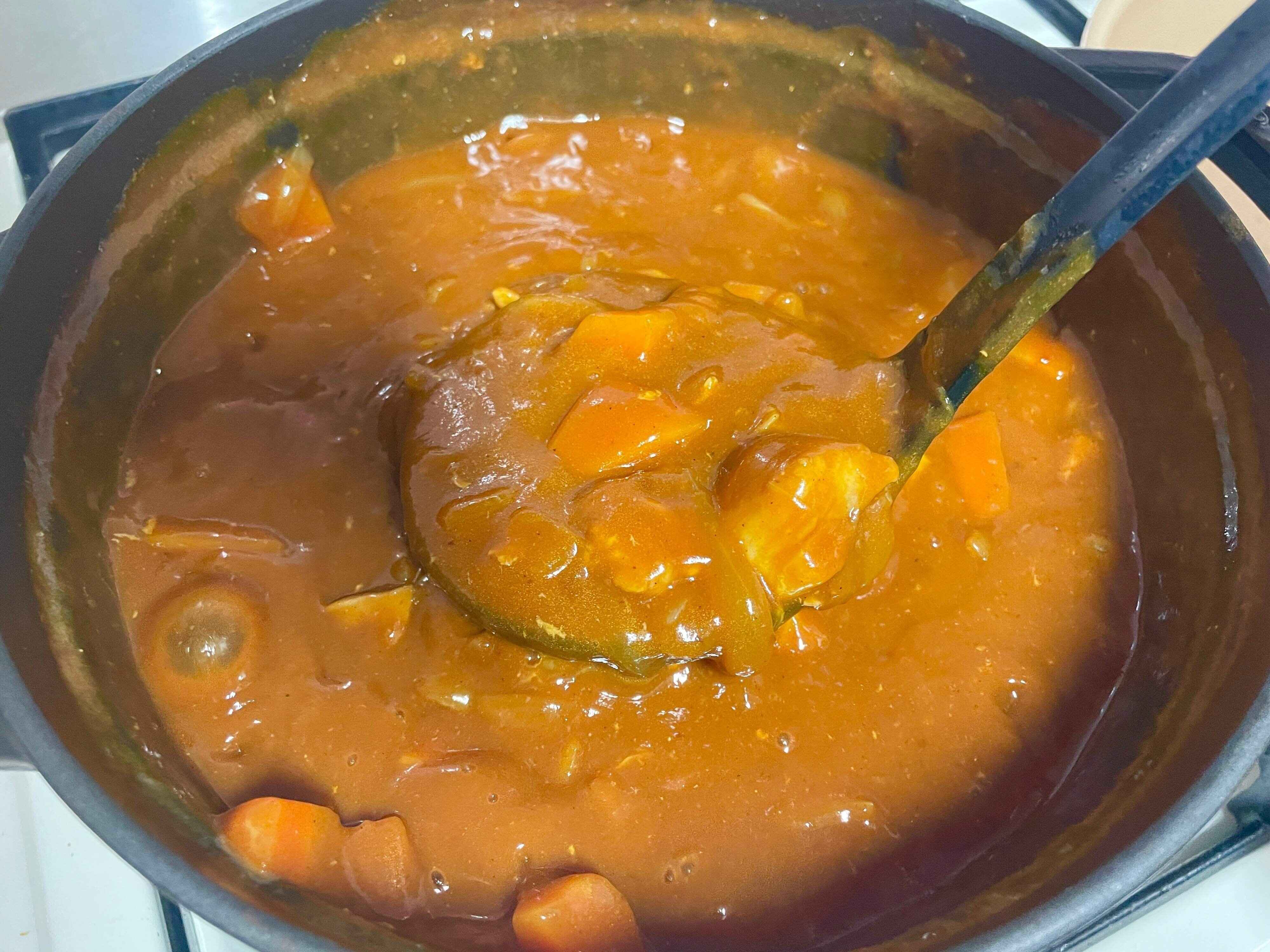 トマトジュース、赤ワイン、牛乳のすべてを入れると、ちょっと複雑な味の本格カレーの完成。市販のルーでつくったとは思えないようなカレーになりますよ。