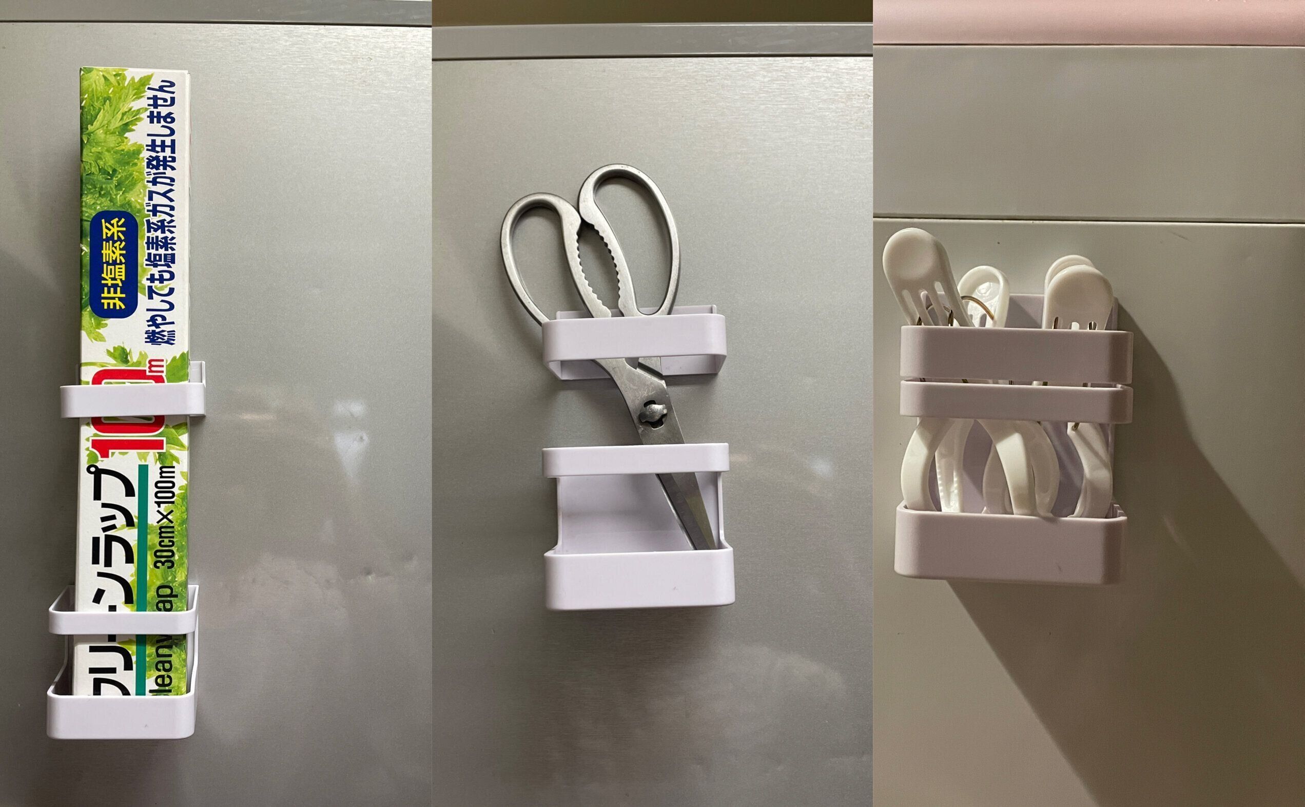 冷蔵庫に貼ってラップホルダーやハサミ入れにしたり、洗濯機に貼って洗濯ばさみを入れたりなど。マグネットが取りつけられる場所で大活躍。