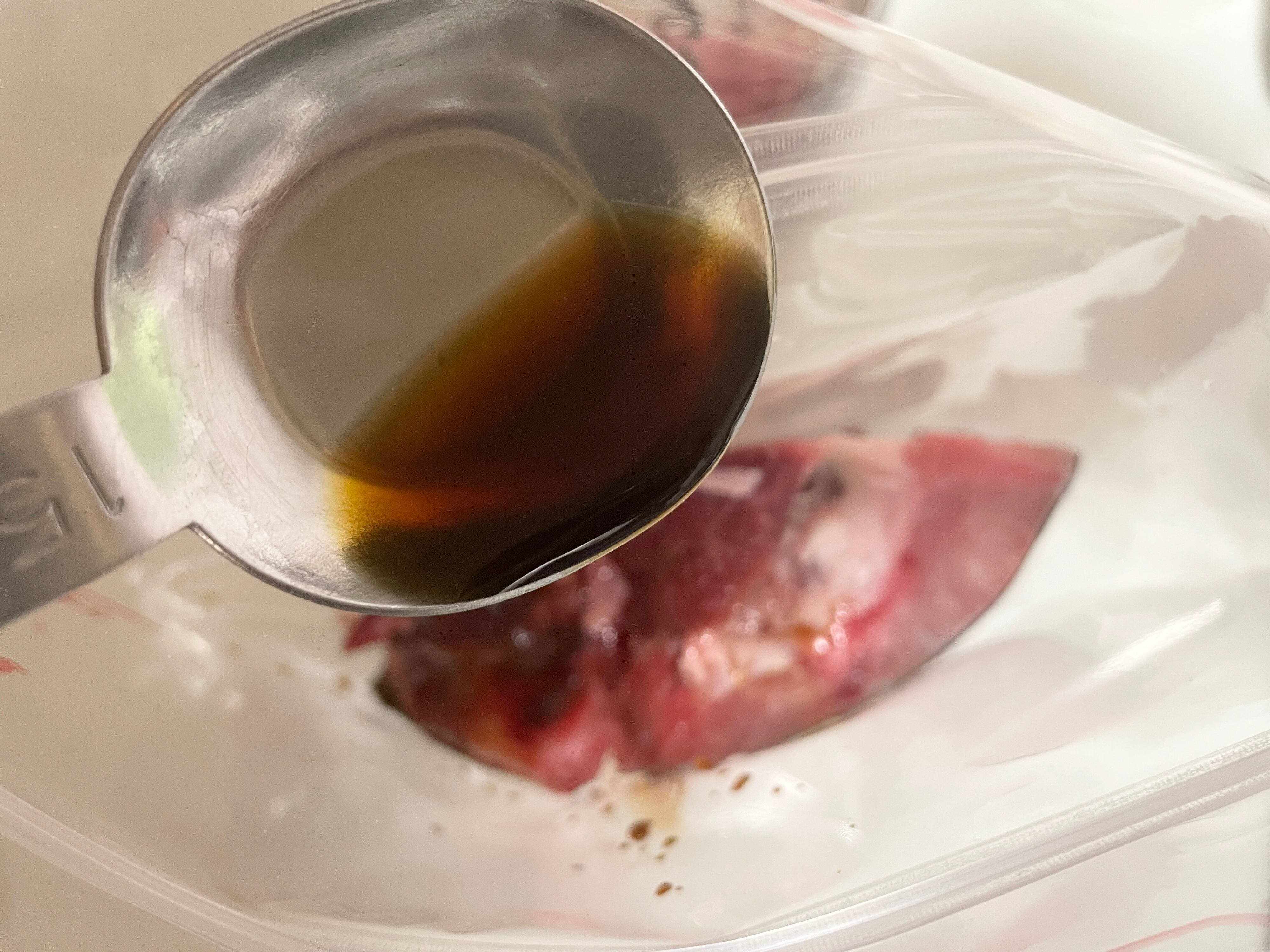 調理バッグにぶりなどの魚を入れたら、すき焼きのたれ大さじ4と水大さじ3、あとはしょうがの千切りを入れて600Wの電子レンジで5分加熱するだけ。
