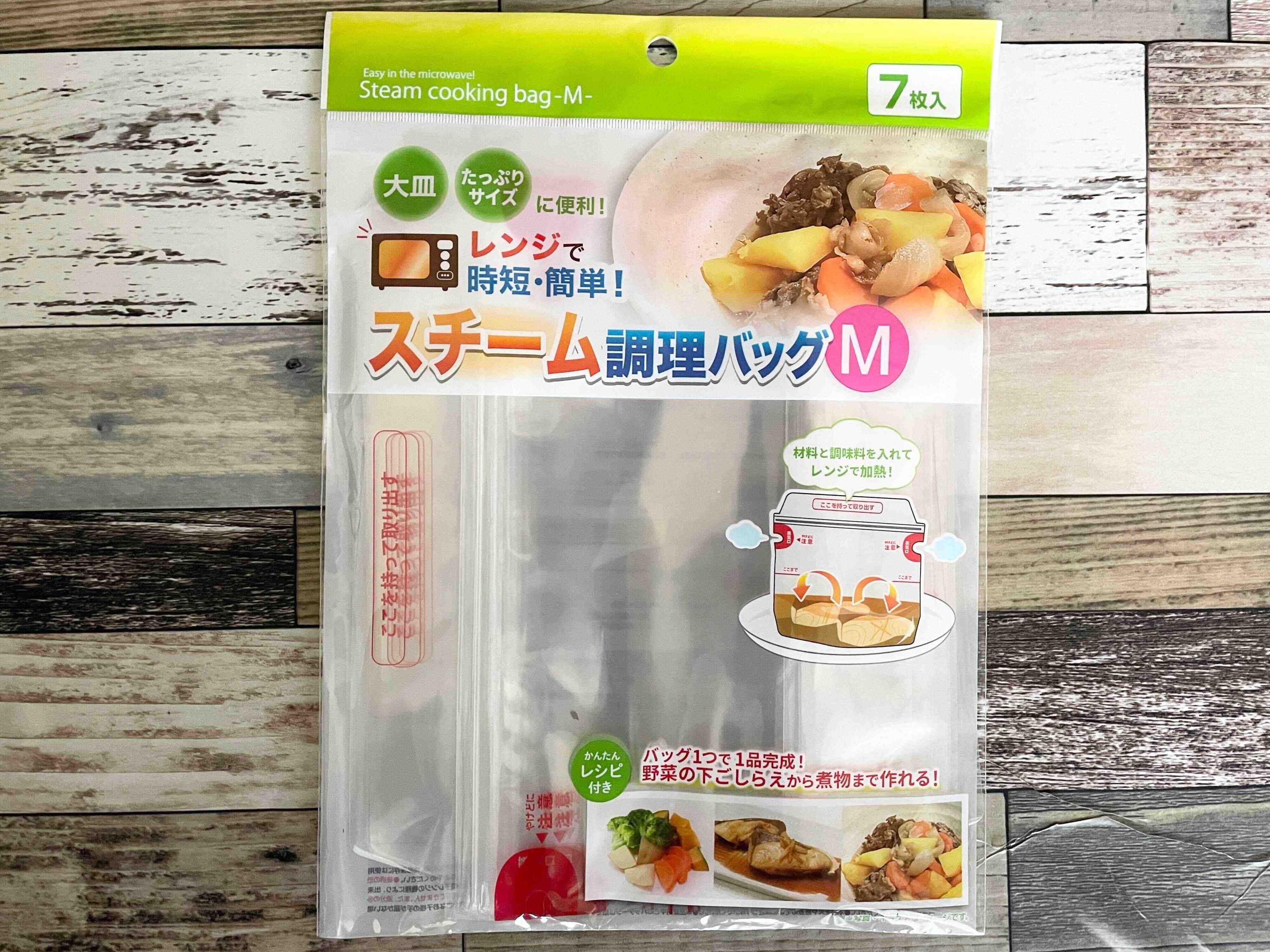 ご紹介するのは、ダイソーの「スチーム調理バッグ」です。MサイズとSサイズがあり、Mが7枚入り、Sが9枚入りで110円ですよ。