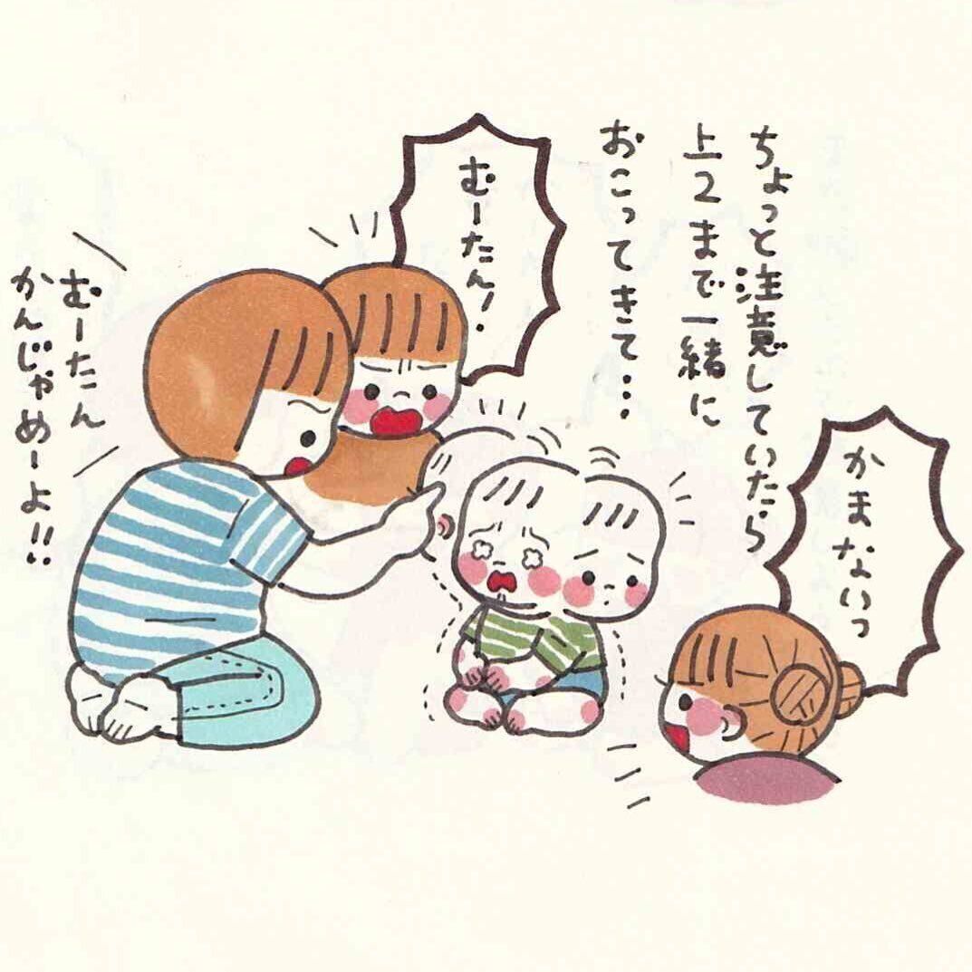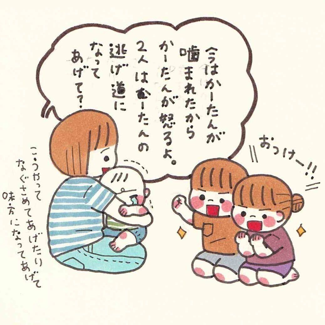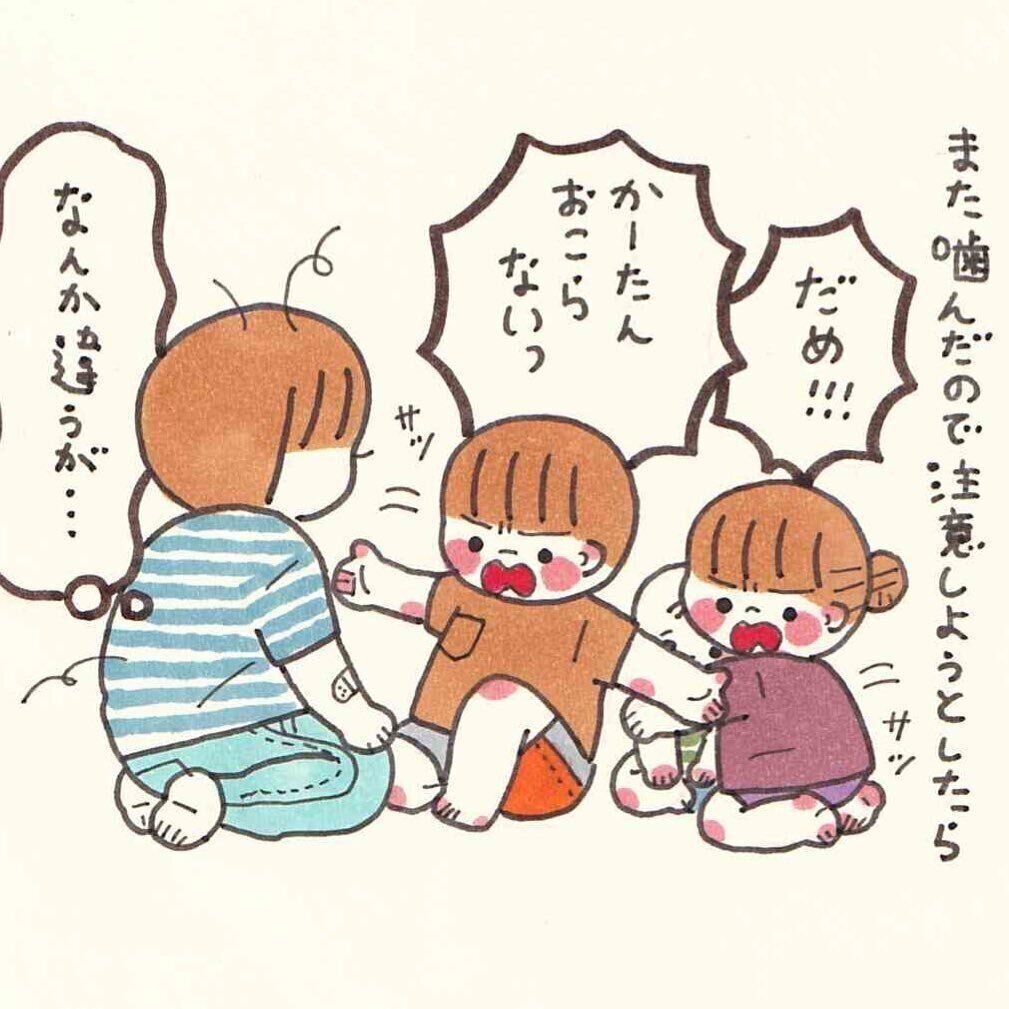 噛まれたhibikさんがむーくんに注意をしていると、ひーくん・すーちゃんもママに加勢します。しかし、それではむーくんがかわいそう……と思ったhibikさん。