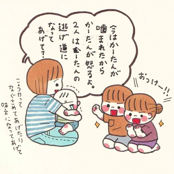 ひーくん・すーちゃんの2人が、むーくんの味方になったり、慰めてあげたりすることを期待して、「2人はむーたんの逃げ道になってあげて」と促すのでした。