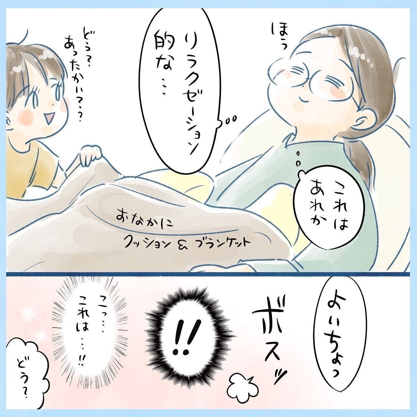 お母さんを幸せにするために運んでくれた癒しのアイテム、クッションやブランケット。
