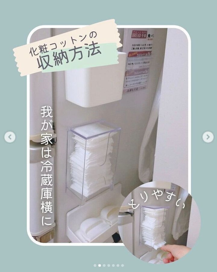 毎日コットンを使うかたは、どのように収納していますか?繊維どうしが絡んで複数枚出てきてしまうこともあったりして、ちょっと取り出しにくいですよね。そんなお悩みを解決してくれるのがこちら。セリアのコットンケースです。上から補充し、下から1枚ずつ取り出して使います。複数枚出てくることもなくストレスフリー!両面テープやマグネットを使って、壁面に貼りつけて使うのもおすすめです。こちらも110円です。