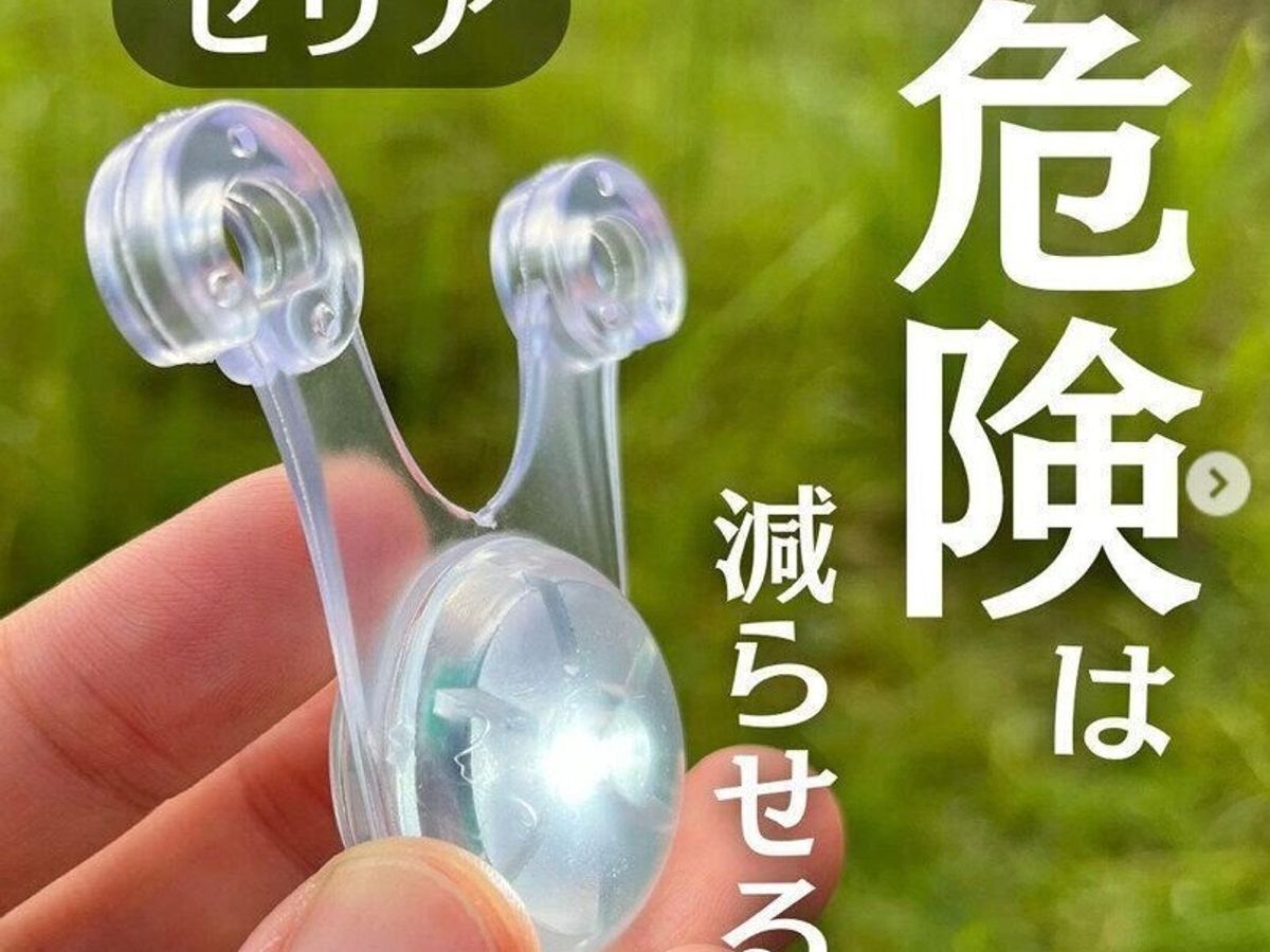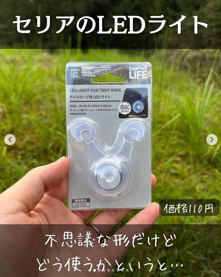 一見何に使うかわからないこちらは、アウトドアで活躍してくれるLEDライトです。左右の穴を使ってテントロープに引っ掛けてLEDを点灯させることで、夜暗い中でロープに足を引っ掛けてしまうのを防ぎます。連続7時間使用可能。点灯・点滅・ゆっくり点滅のモードがあるのも便利です。110円なら、いくつかアウトドアに持っていきたいアイテムですね!