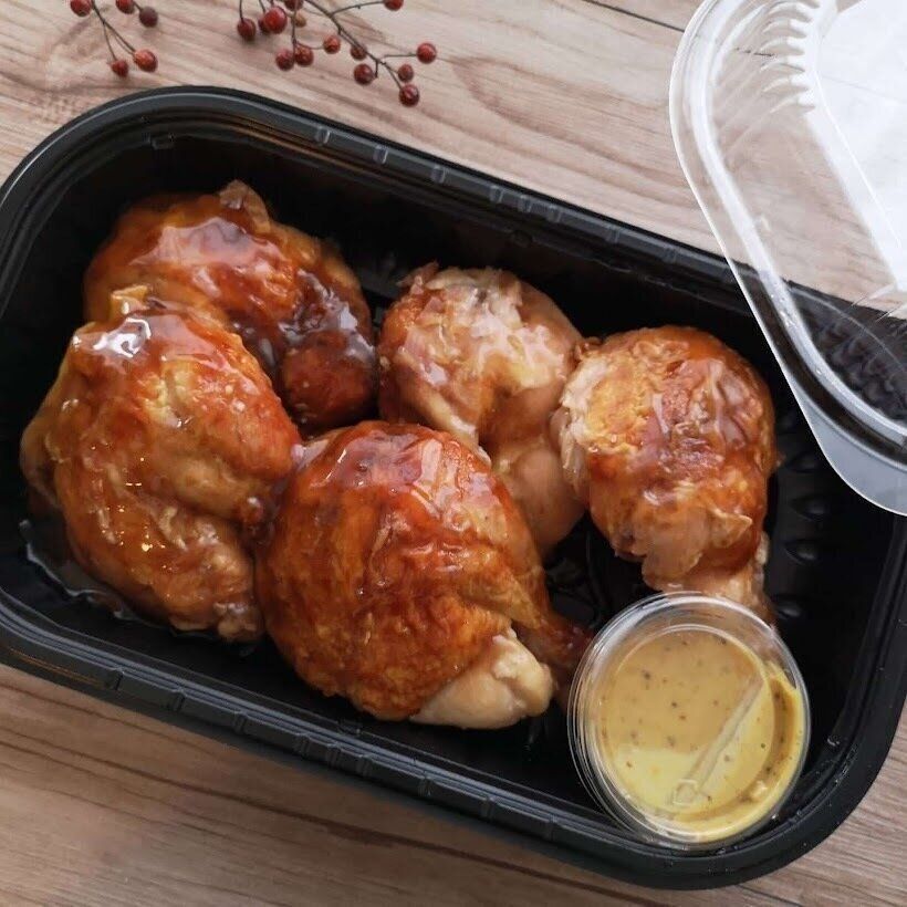 「ロティサリーチキン」をベースに、さらにテリヤキソース風のソースでからめられていて、大振りなカットのモモ部分が5つ入っています。