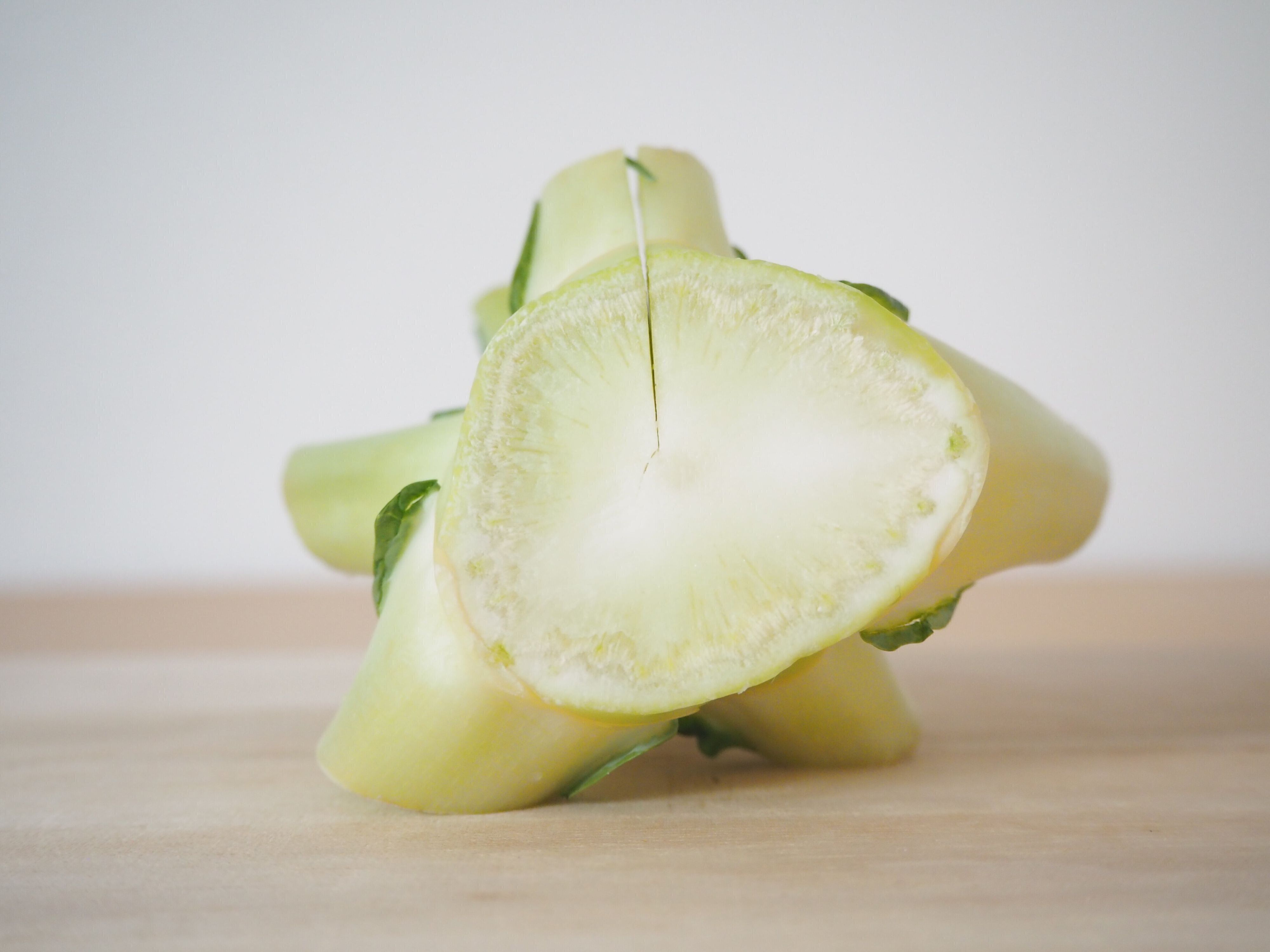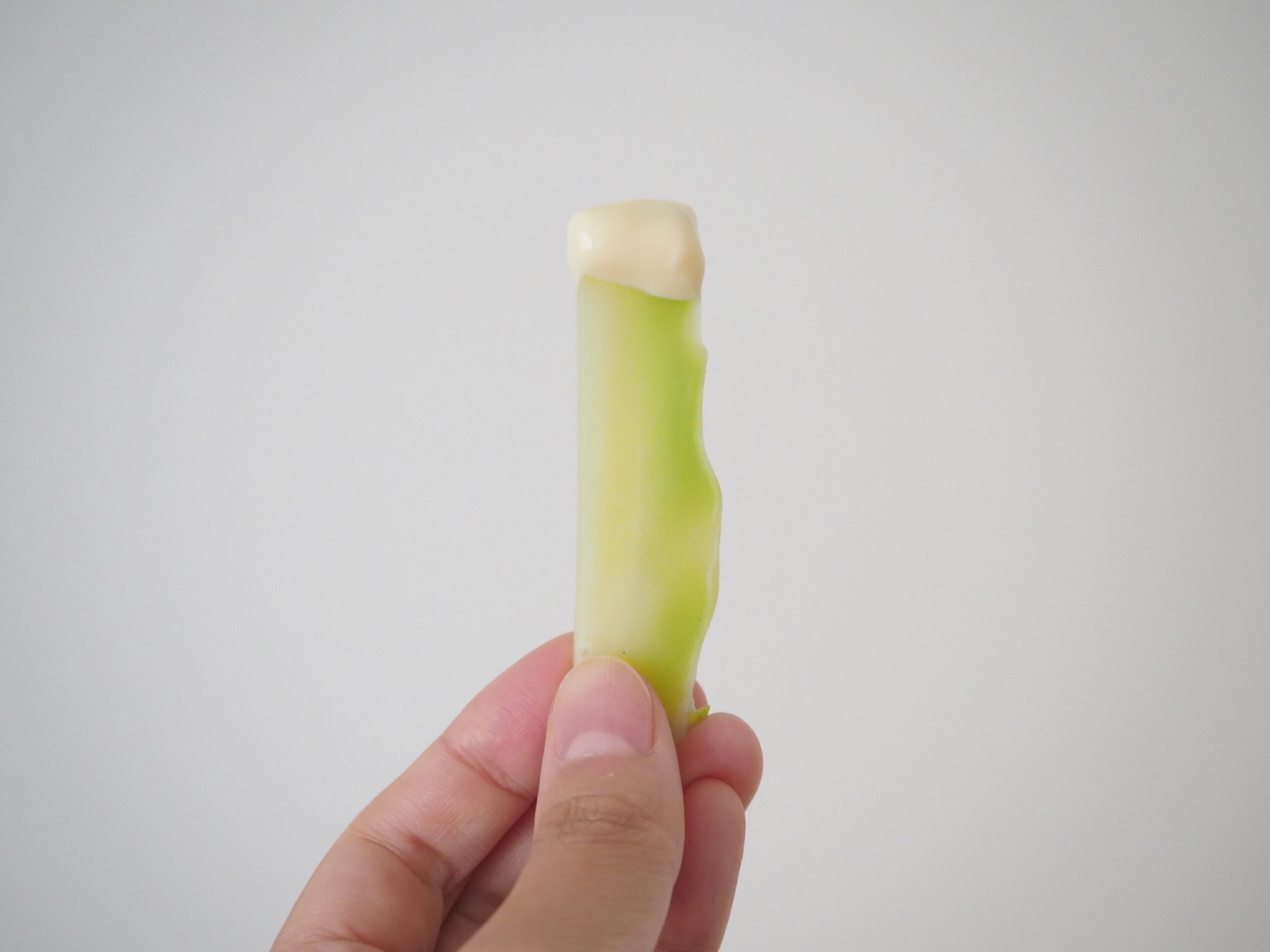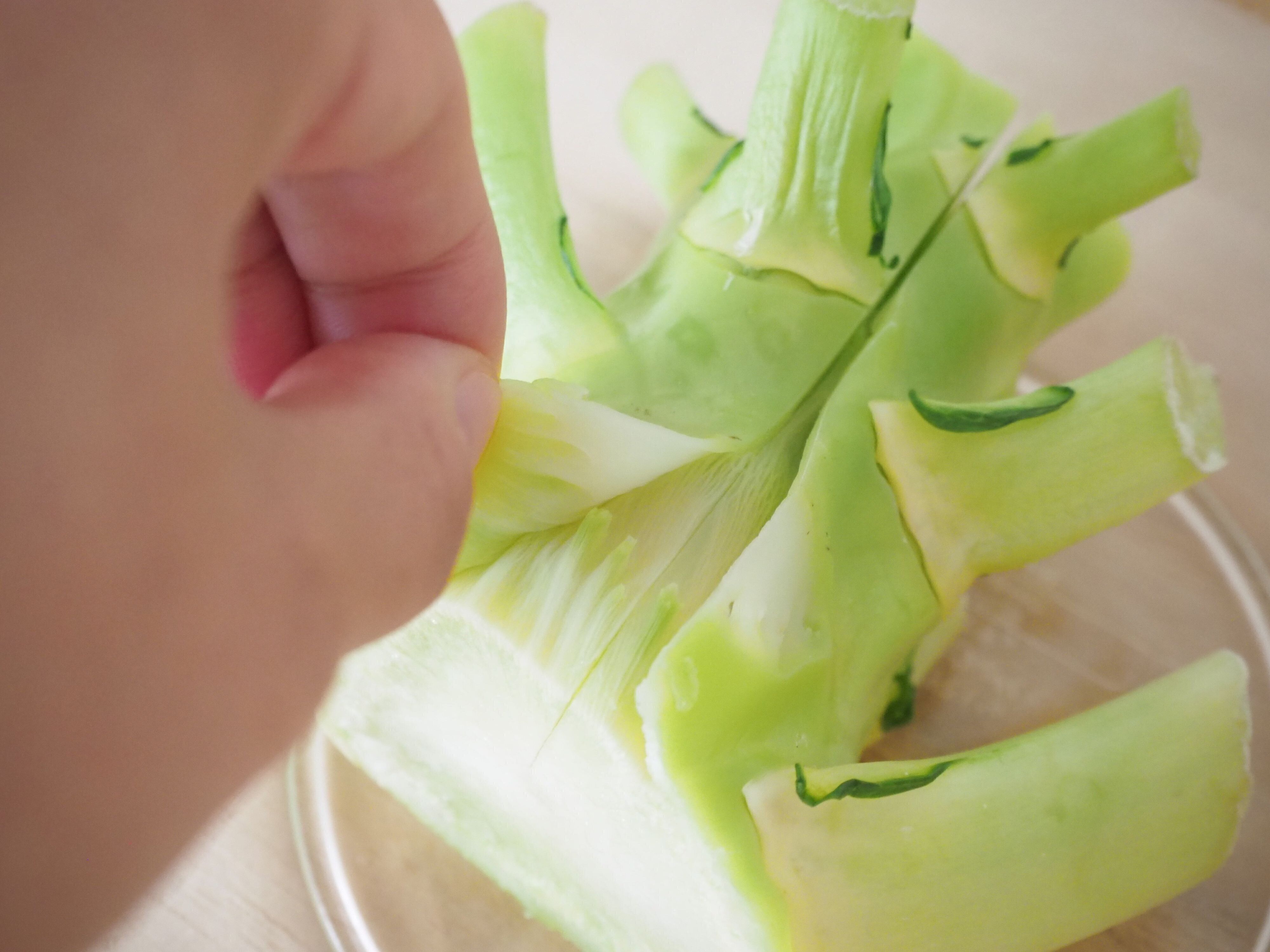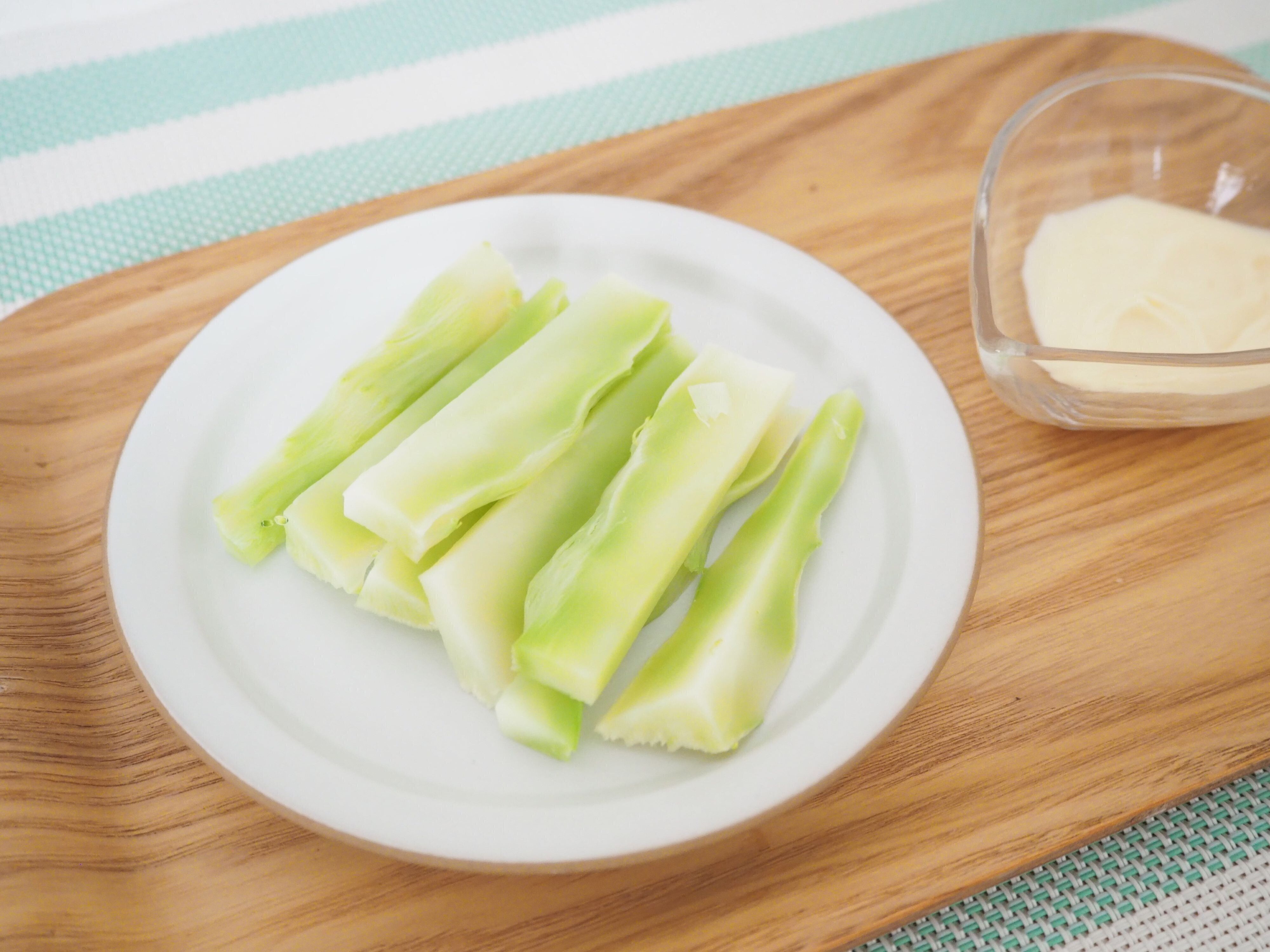 皮をむいた茎はスティック状にカットし、シンプルにマヨネーズにつけて食べてみました。しっかりと加熱されていますが、程よく硬さも残っていて、おいしく食べることができました。